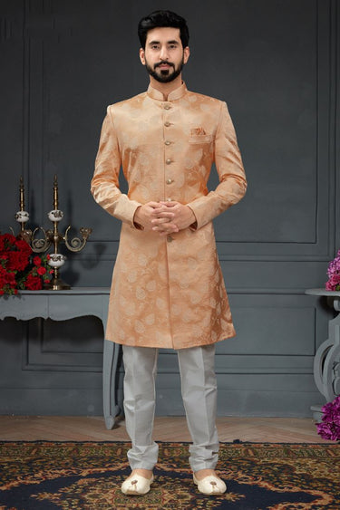Jacquard Peach Color Wedding Wear Readymade Designer Men Indo Western