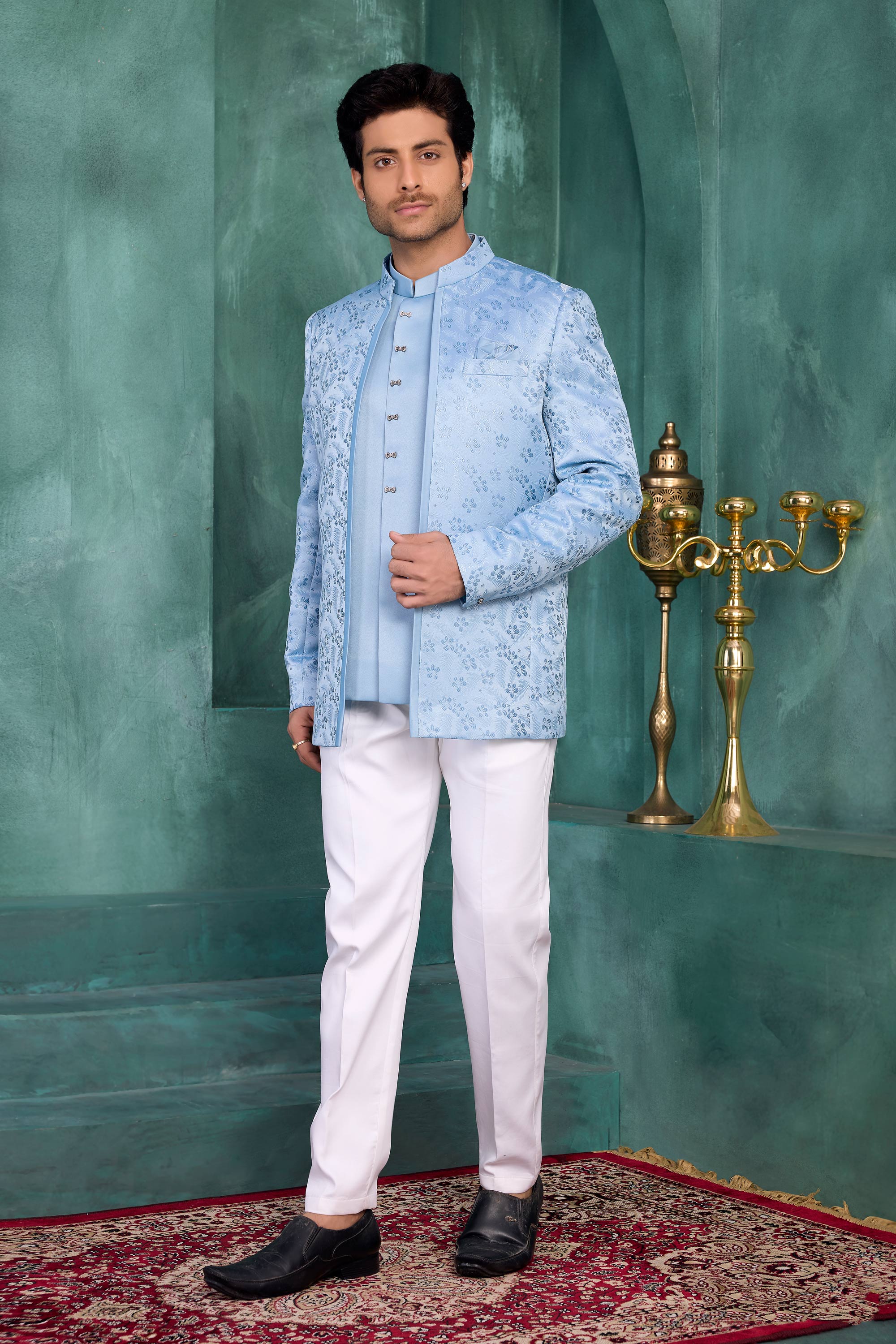 Jacquard Silk Blue Wedding Wear Readymade Jodhpuri Jacket