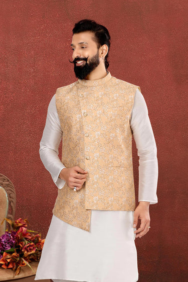 Jacquard Silk Fabric Peach Color Wedding Wear Designer Readymade Jacket For Men