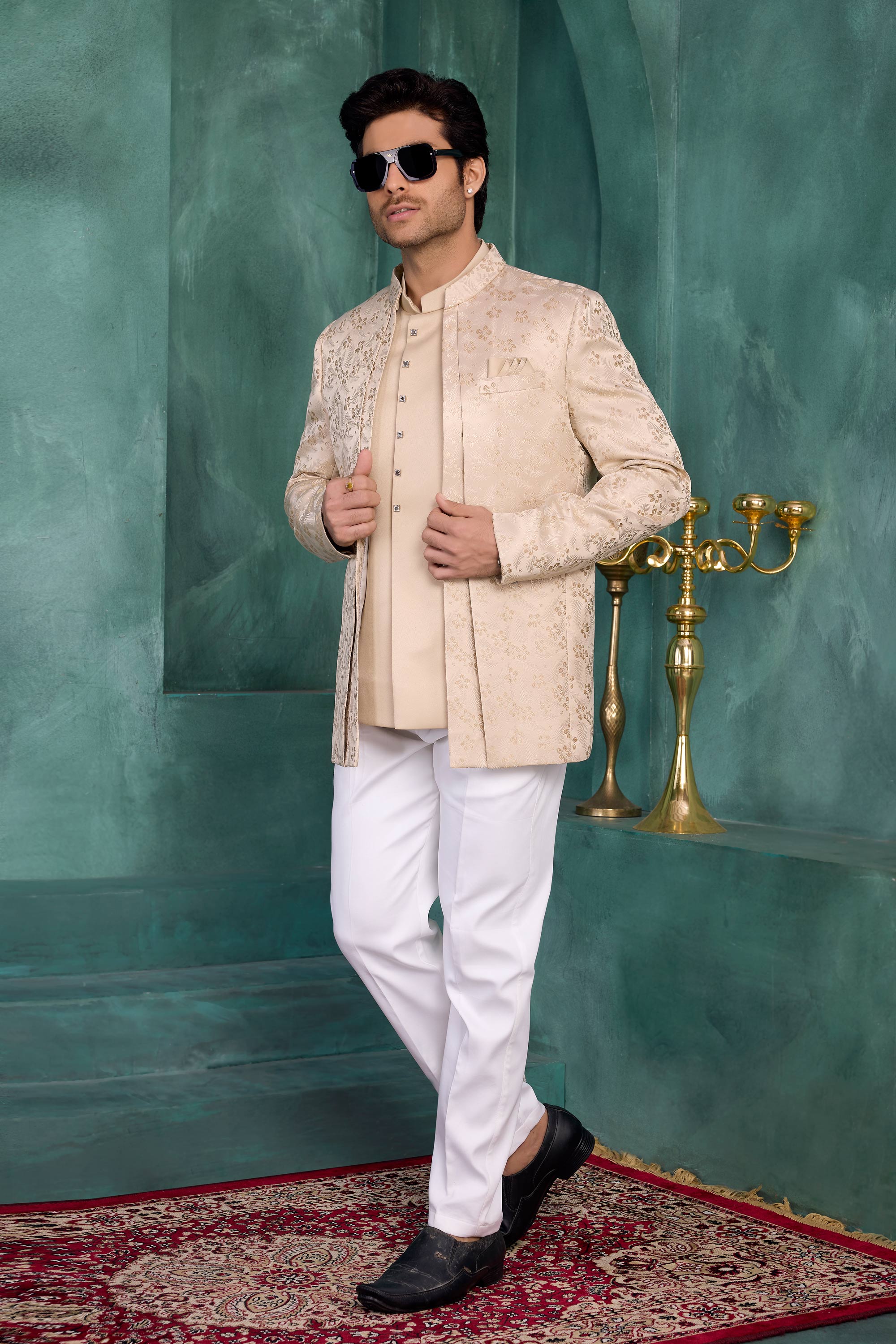 Jacquard Silk Peach Wedding Wear Readymade Jodhpuri Jacket