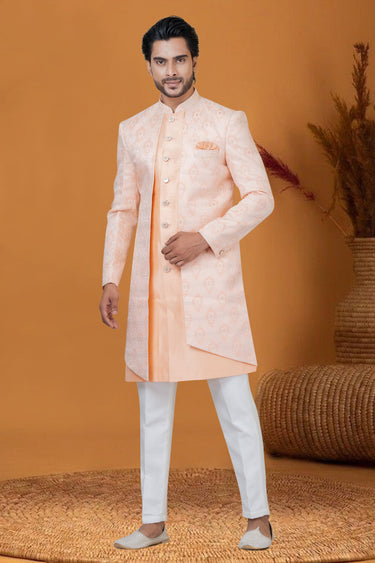 Jacquard Work Pretty Jacquard Silk Fabric Sangeet Wear Readymade Men Indo Western In Peach Color