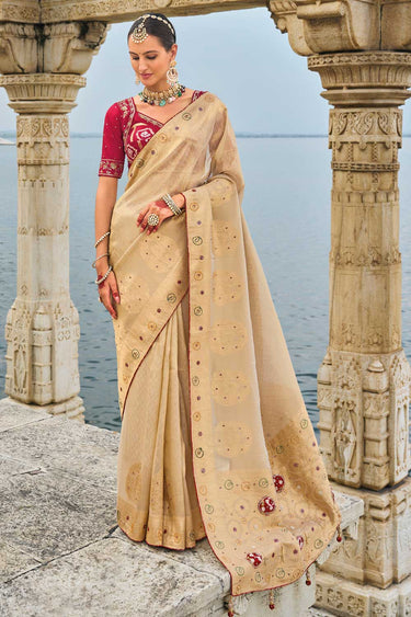 Kanjivaram Fabric Heavy Embroidered Work Luxurious Saree In Beige Color