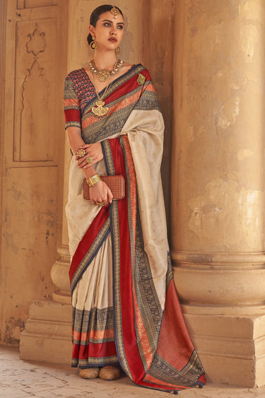 Kanjivaram Silk Fabric Beige Color Weaving Print Festive Wear Trendy Saree With Patola Design Blouse