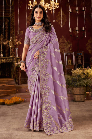 Lavender Embroidered Border Work Art Silk Festive Wear Saree
