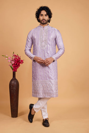 Lavender Festive Wear Art Silk Embroidered Kurta Pyjama For Men