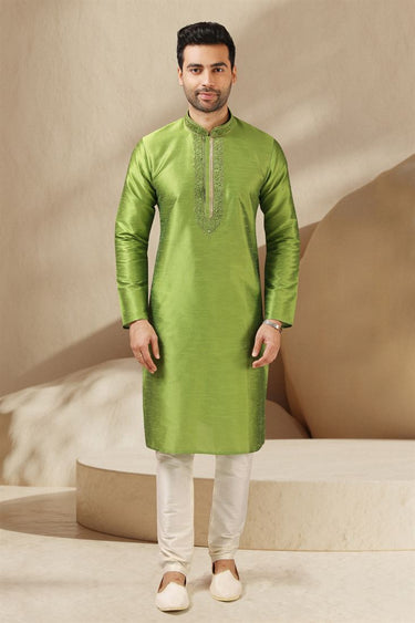 Lovely Green Color Banarasi Art Silk Fabric Sangeet Wear Readymade Kurta Pyjama For Men