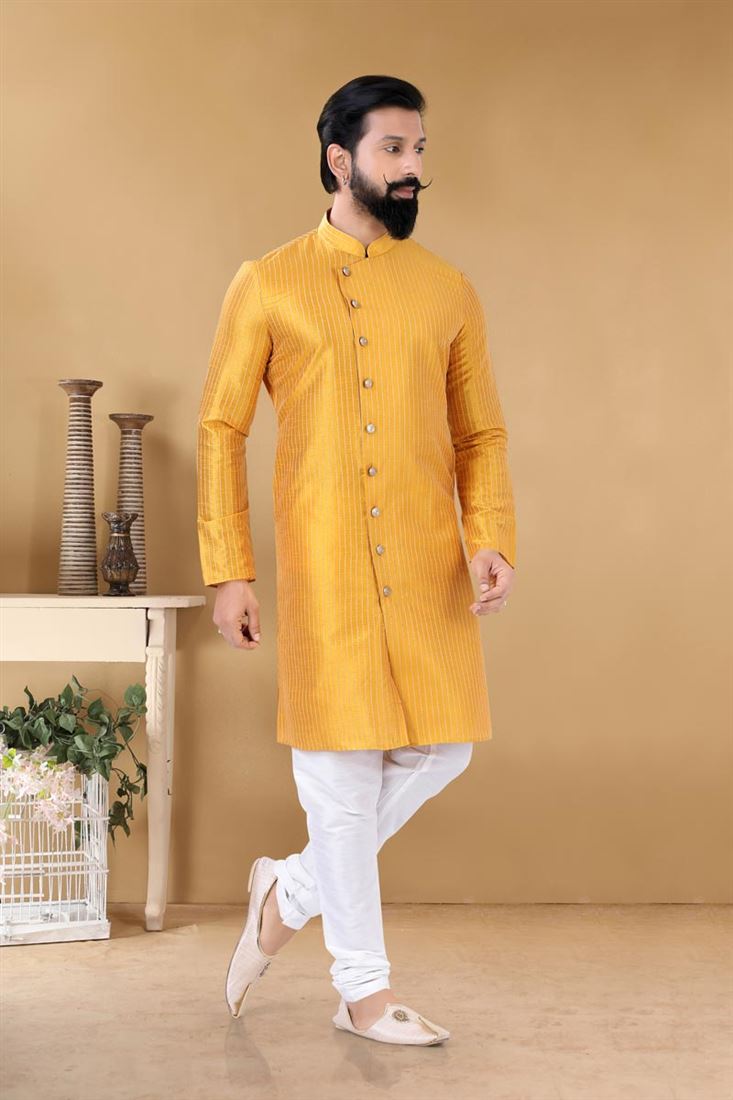 Magnificent Mustard Color Art Silk Fabric Wedding Wear Designer Readymade Kurta Pyjama For Men