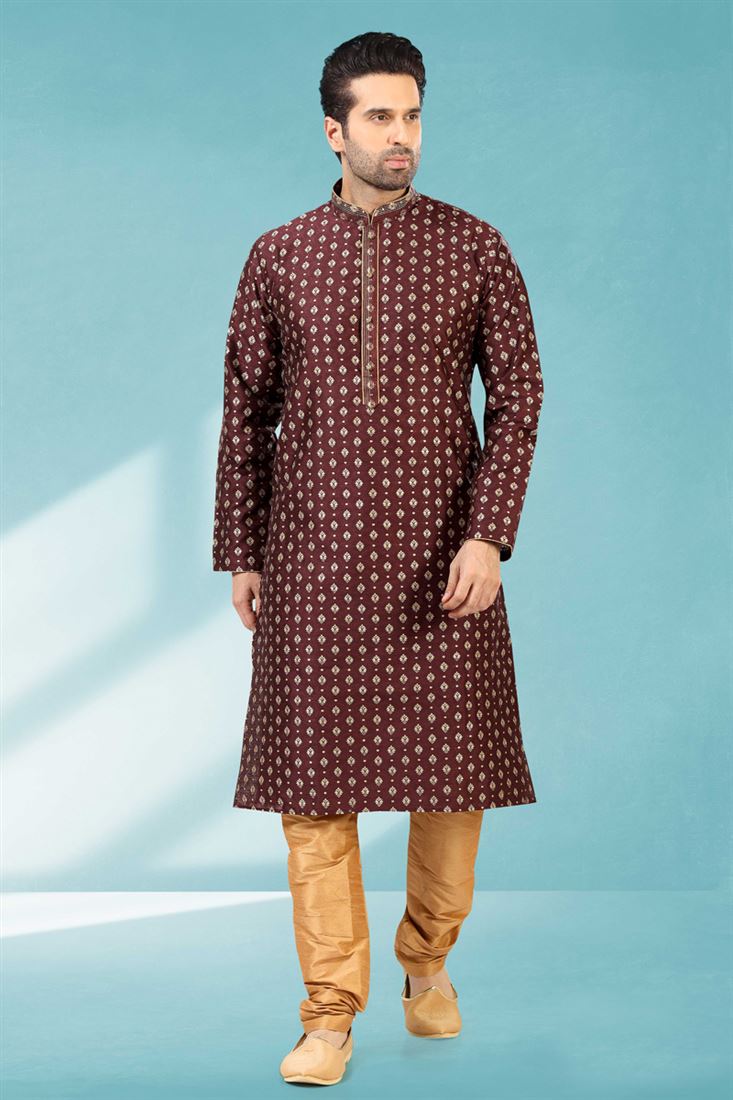 Magnificent Wine Color Art Silk Fabric Wedding Wear Readymade Kurta Pyjama For Men