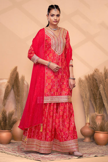 Majesty Bandhani Print Readymade Palazzo Dress In Red Color