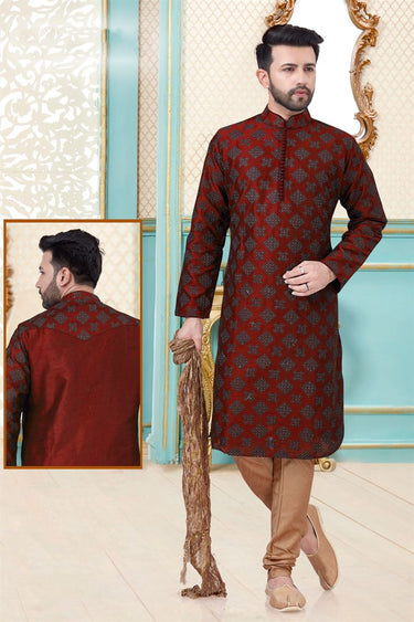 Maroon Color Art Silk Fabric Embroidered Reception Wear Men Kurta Pyjama
