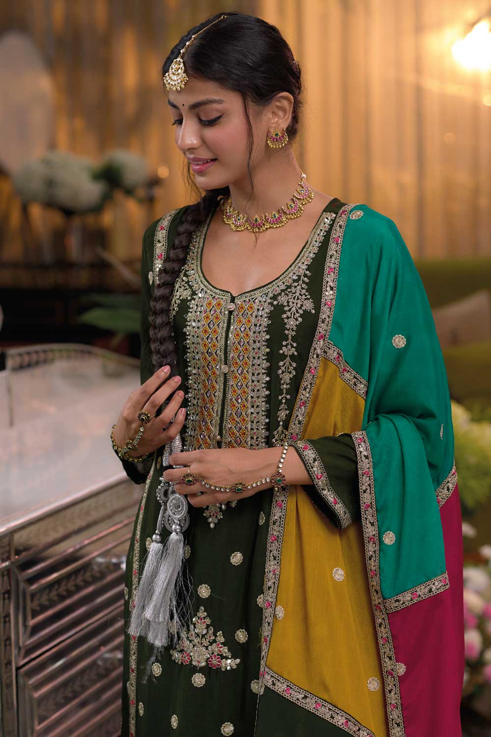 Step into elegance with this exquisite Readymade Salwar Suit, designed to make you stand out at any function. The top is crafted from heavy Chinon fabric, adorned with intricate embroidery work that exudes sophistication. Paired with a luxurious heavy silk bottom and a matching heavy Chinon dupatta, this outfit brings together tradition and contemporary style effortlessly. Available in sizes 38 to 42, it offers a flattering fit for various body types. Perfect for weddings, receptions, or festive gatherings, this ensemble is a must-have for those who appreciate fine craftsmanship. Slight color variations may occur due to different lighting conditions.