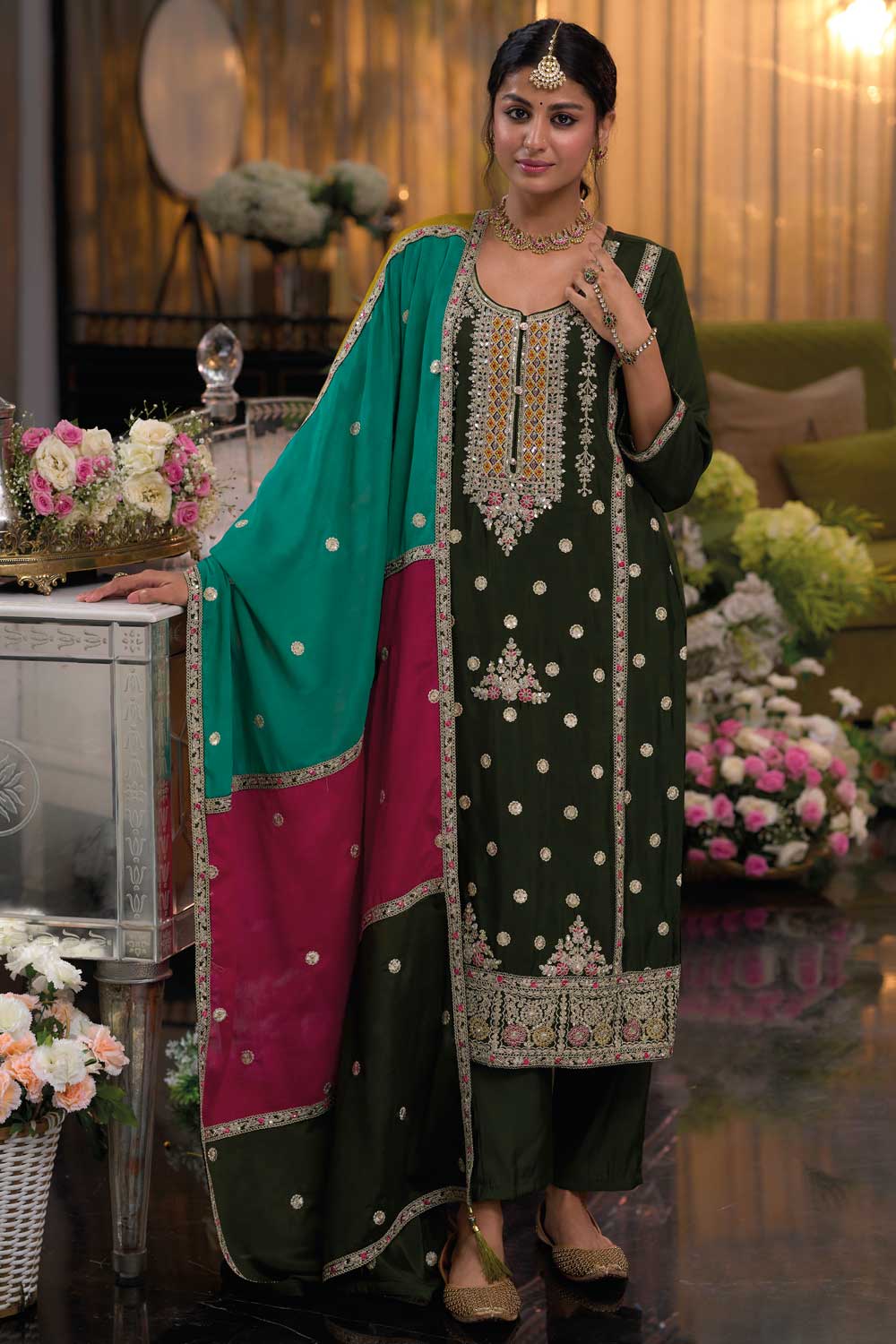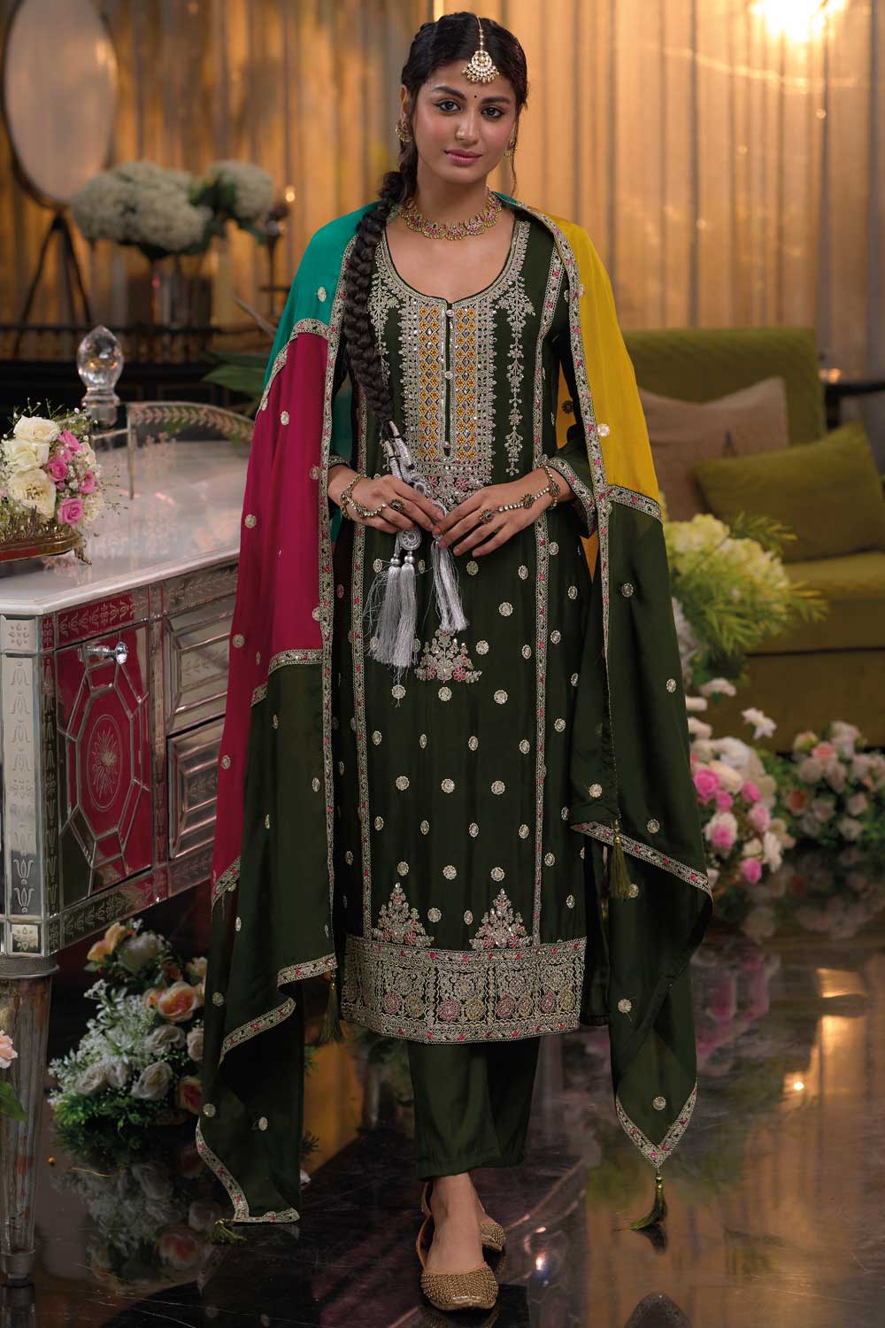 Mehendi Green Readymade Salwar Suit with Embroidered Design