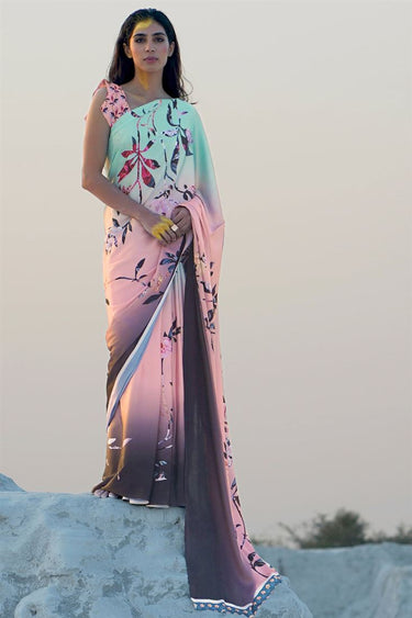 Multi Color Pure Satin Crepe Saree With Digital Printed Blouse