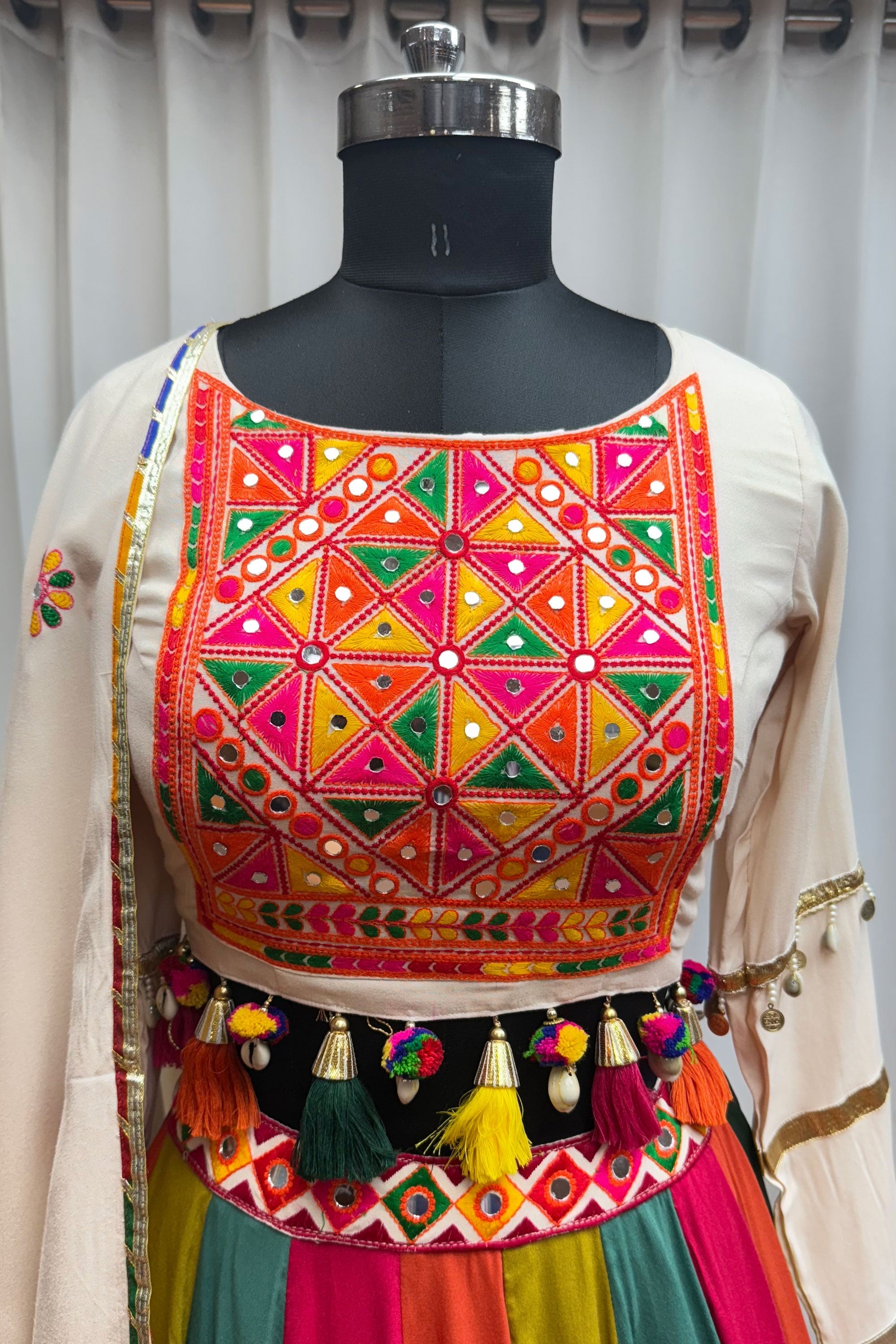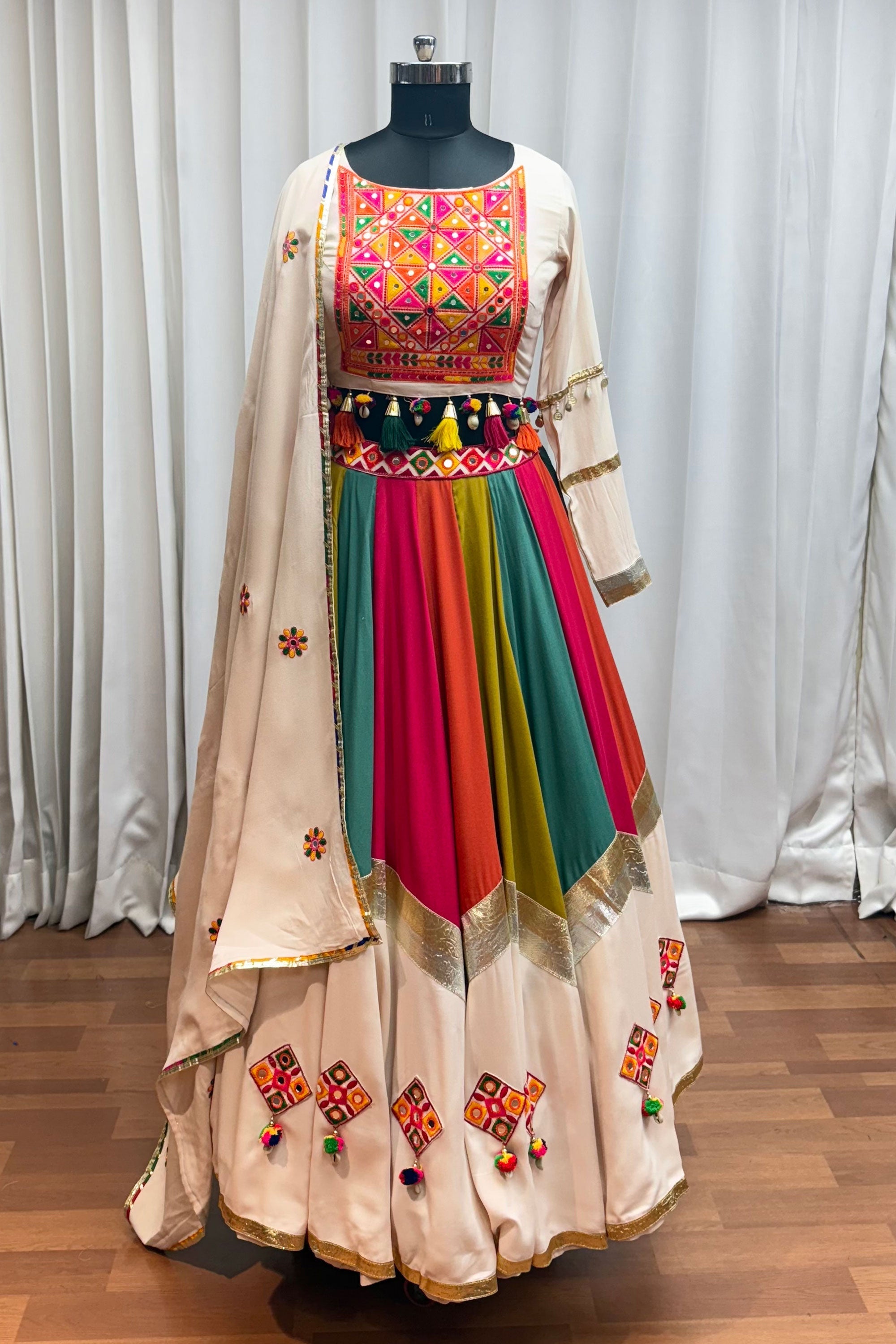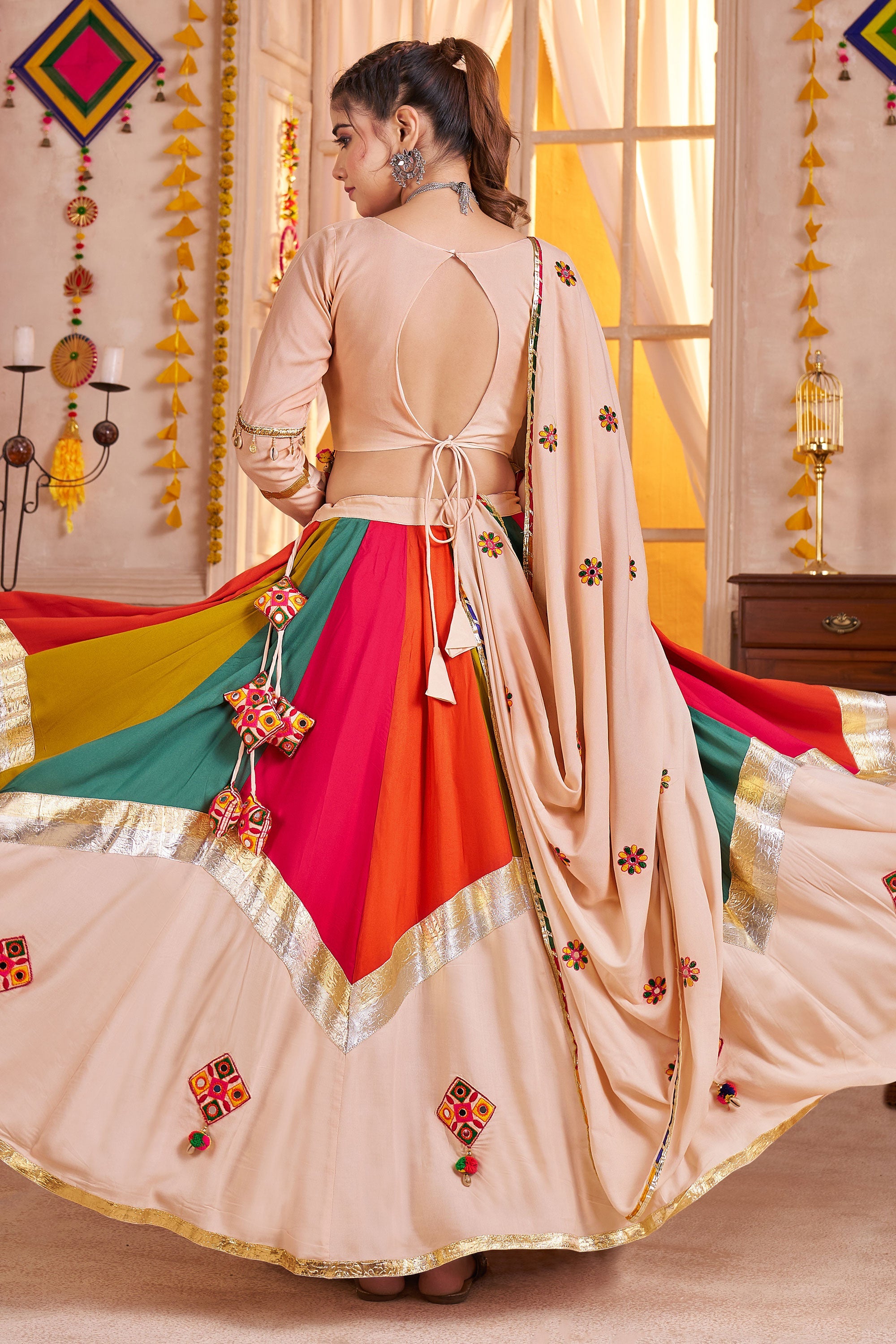 Get ready for Navratri in style with this beautiful viscose cotton readymade lehenga. This traditional outfit features intricate mirror work embroidery, designed to shine and capture attention during the festivities. Crafted for comfort and elegance, the lehenga allows easy movement, perfect for energetic Garba and Dandiya nights. Its lightweight yet durable material ensures all-night comfort, while the fine embroidery adds a rich, ethnic appeal. Pair it with matching jewelry and your favorite footwear for the perfect celebratory look. Make this Navratri truly special with this stylish and hassle-free outfit that blends tradition with modern comfort.