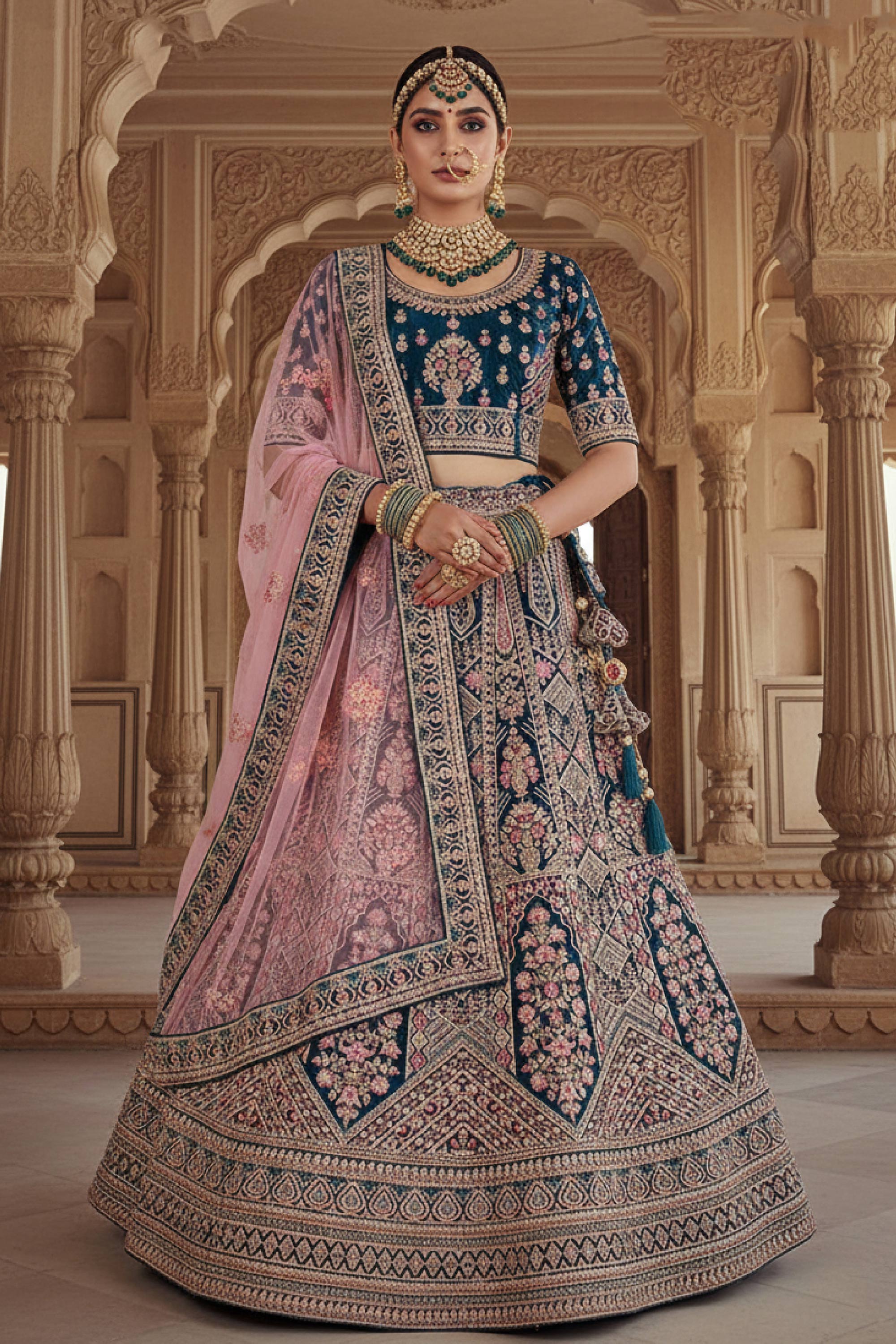 Celebrate your wedding in true royal style with this exquisitely crafted Bridal Lehenga. The rich velvet lehenga is adorned with heavy embroidery, showcasing fine craftsmanship and luxurious appeal. Note: Due to digital photography, slight color variations may occur.