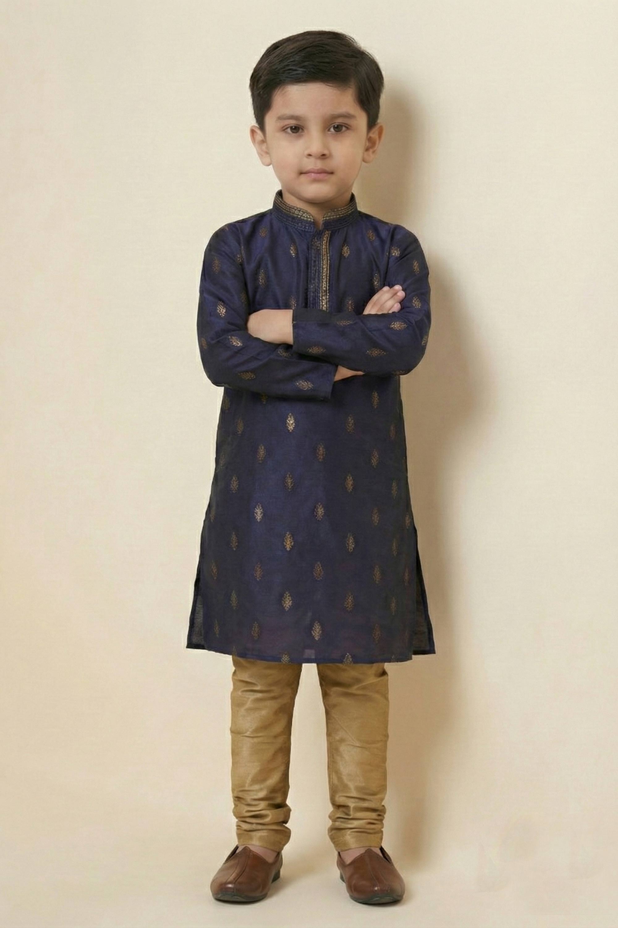 Navy Blue Silk Fabric Boys Readymade Kurta Pyjama For Festive Wear