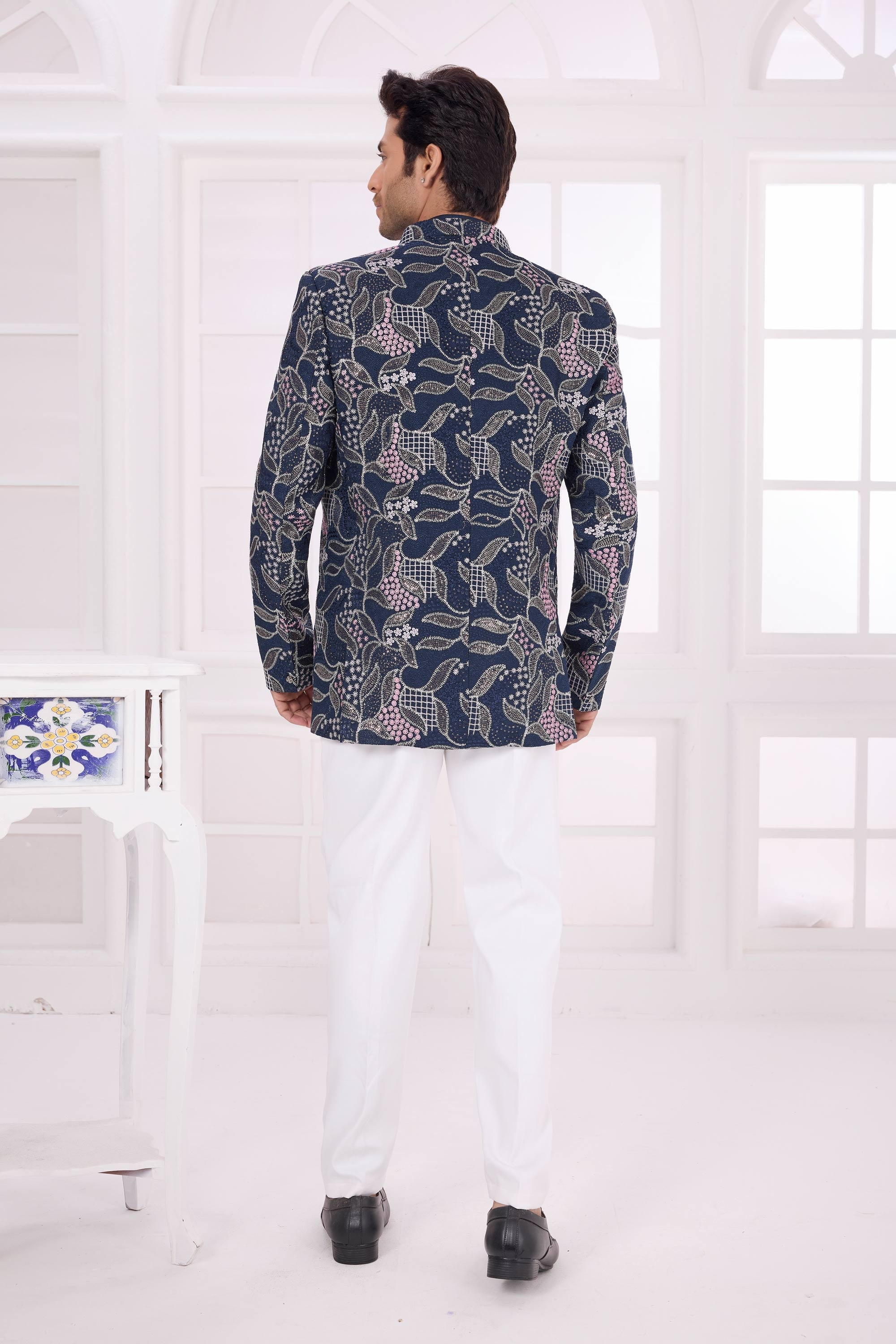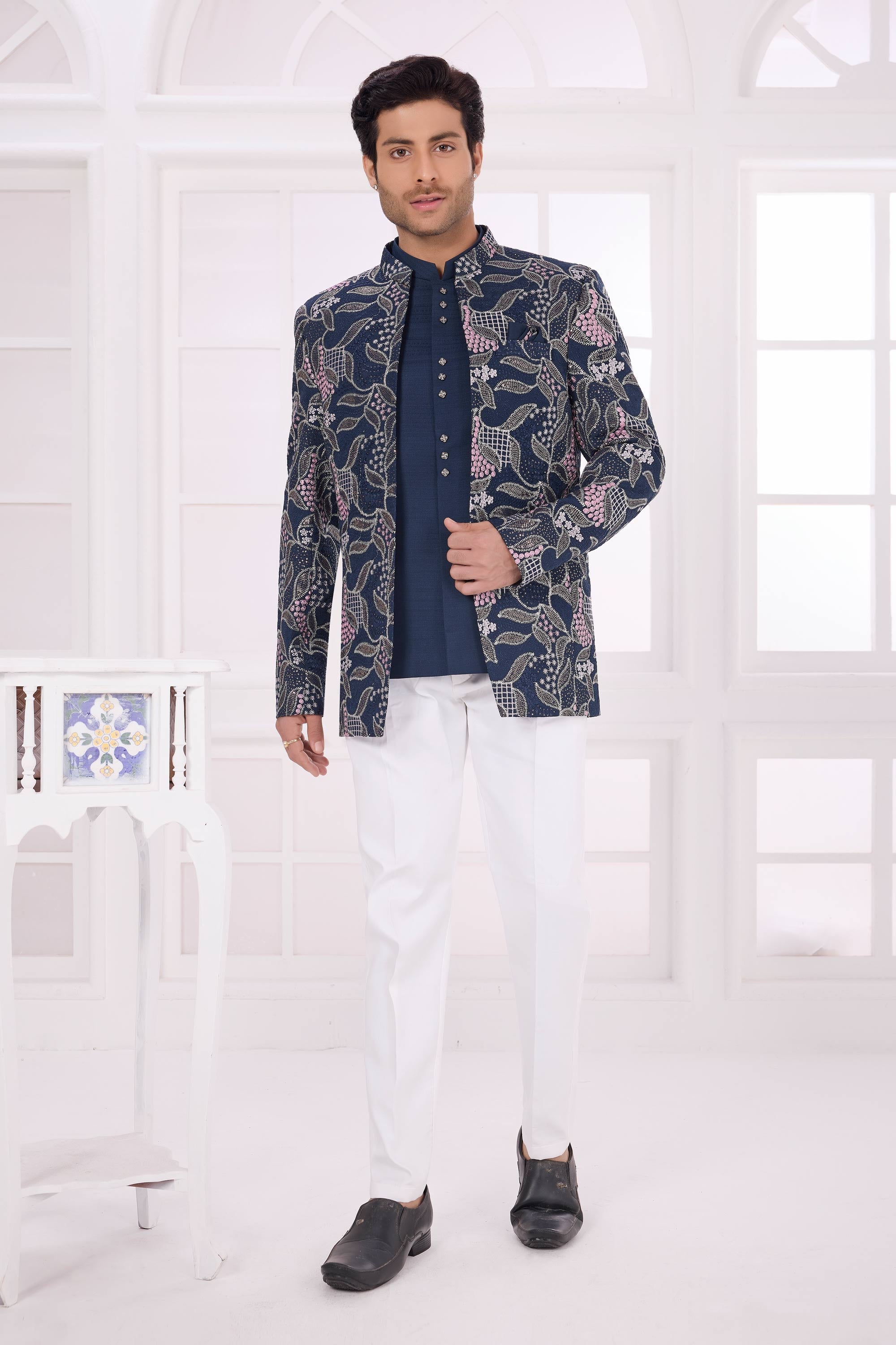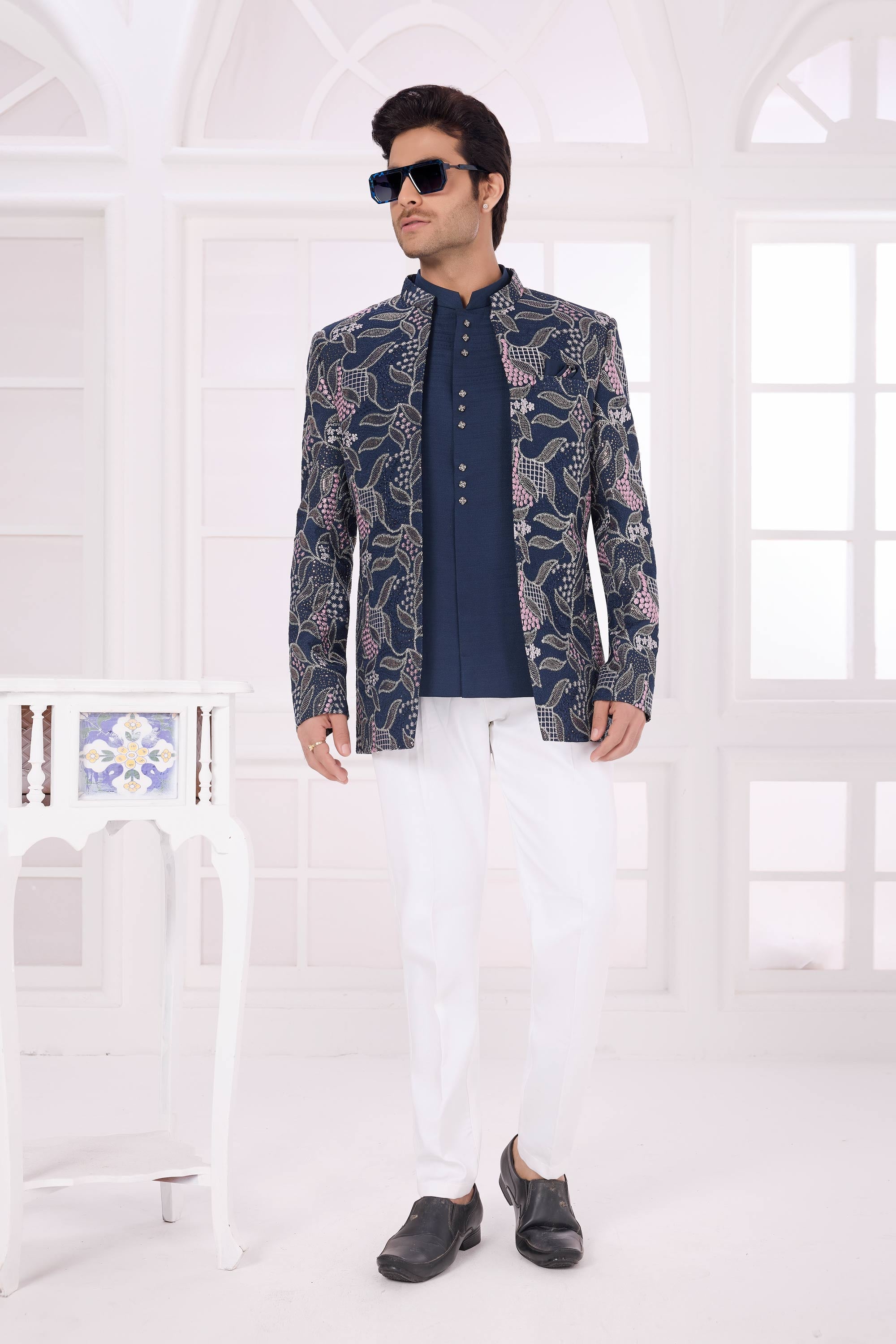 Navy Blue Wedding Wear Art Silk Readymade Jodhpuri Jacket
