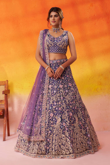 Net Fabric Embroidered Purple Wedding Wear Lehenga Choli With Dupatta