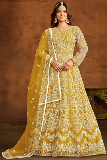 Net Fabric Fancy Embroidered Festive Wear Anarkali Salwar Kameez In Yellow Color