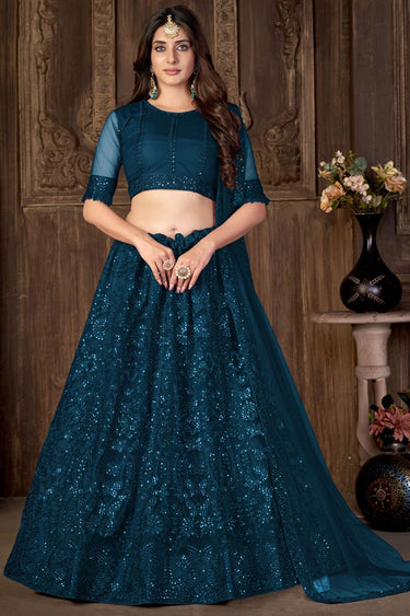 Net Fabric Teal Color Elegant Embroidered Work Lehenga