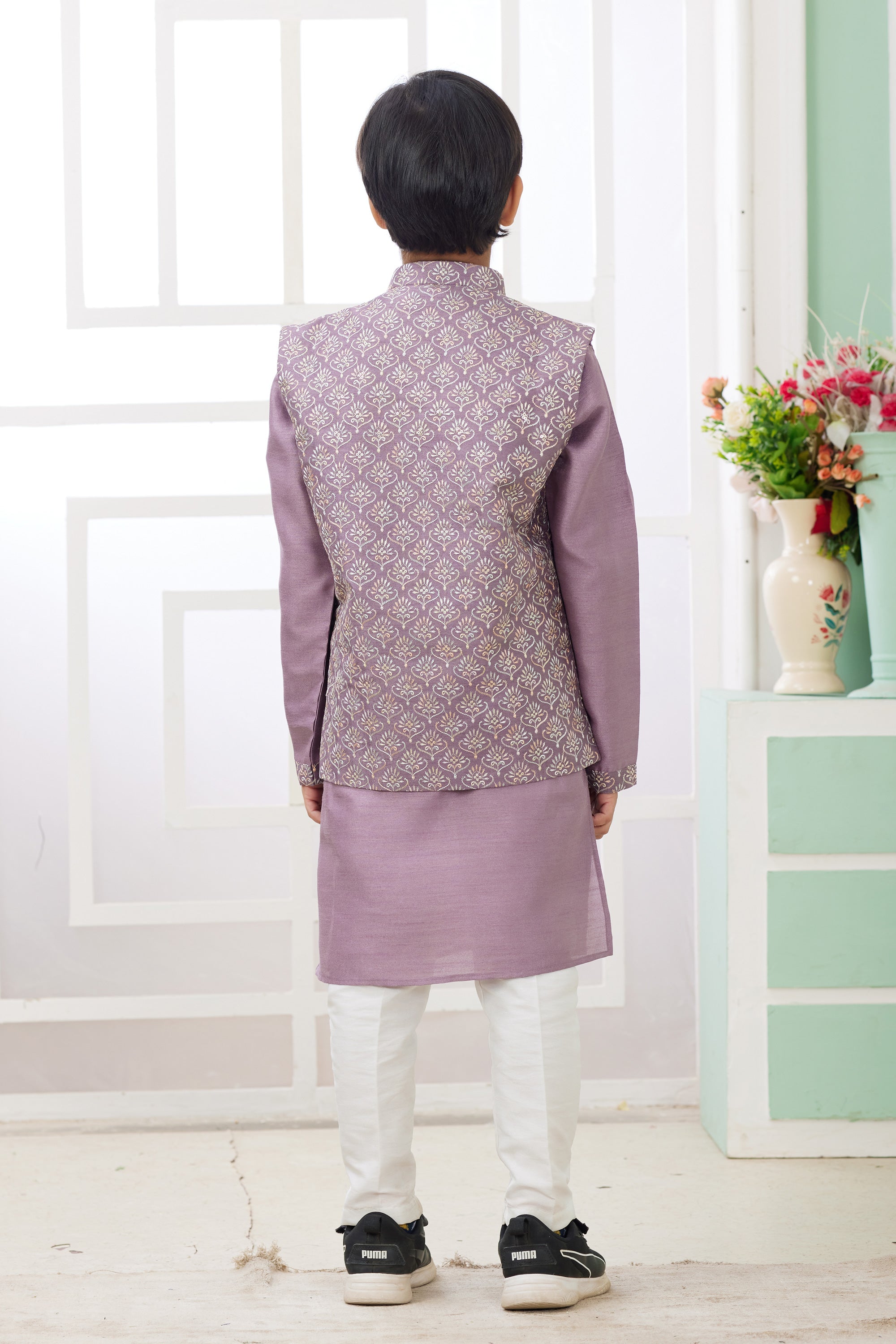 Elevate your child's wardrobe with this stunning Art Silk Kurta Pyjama set, featuring a traditional yet modern design. Made from high-quality art silk, this ready-to-wear outfit is comfortable and perfect for any special occasion. The included designer jacket adds an extra touch of elegance and style. Easy to wear and maintain, this set ensures your little one looks sharp and feels great all day long.