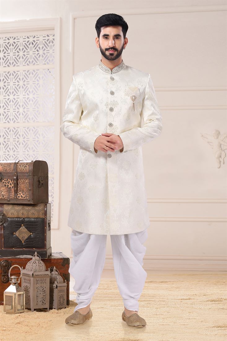 Off White Jacquard Fabric Magnificent Readymade Men Indo Western For Wedding Wear
