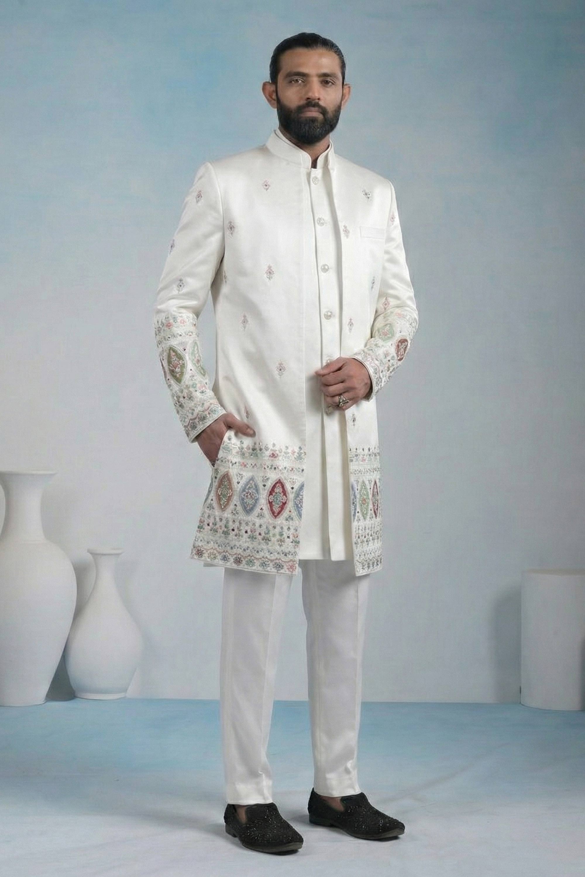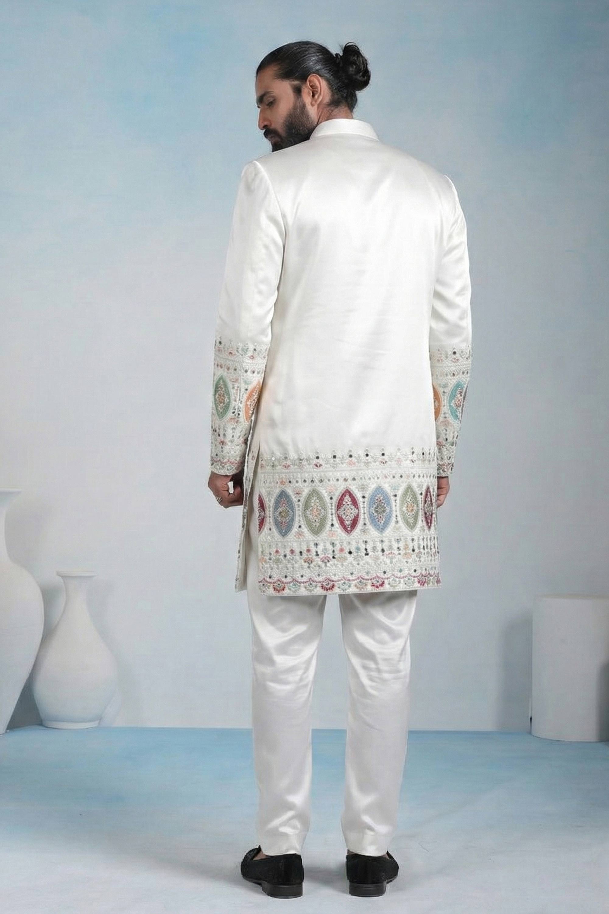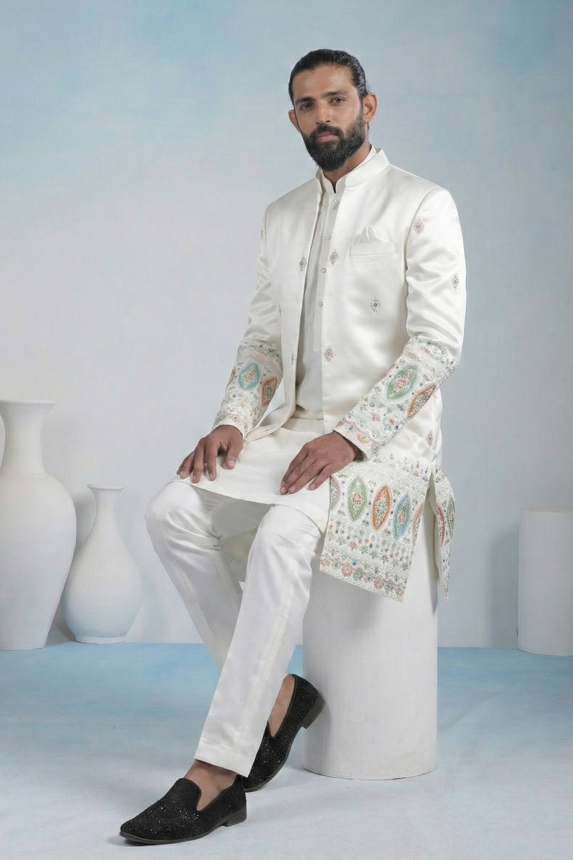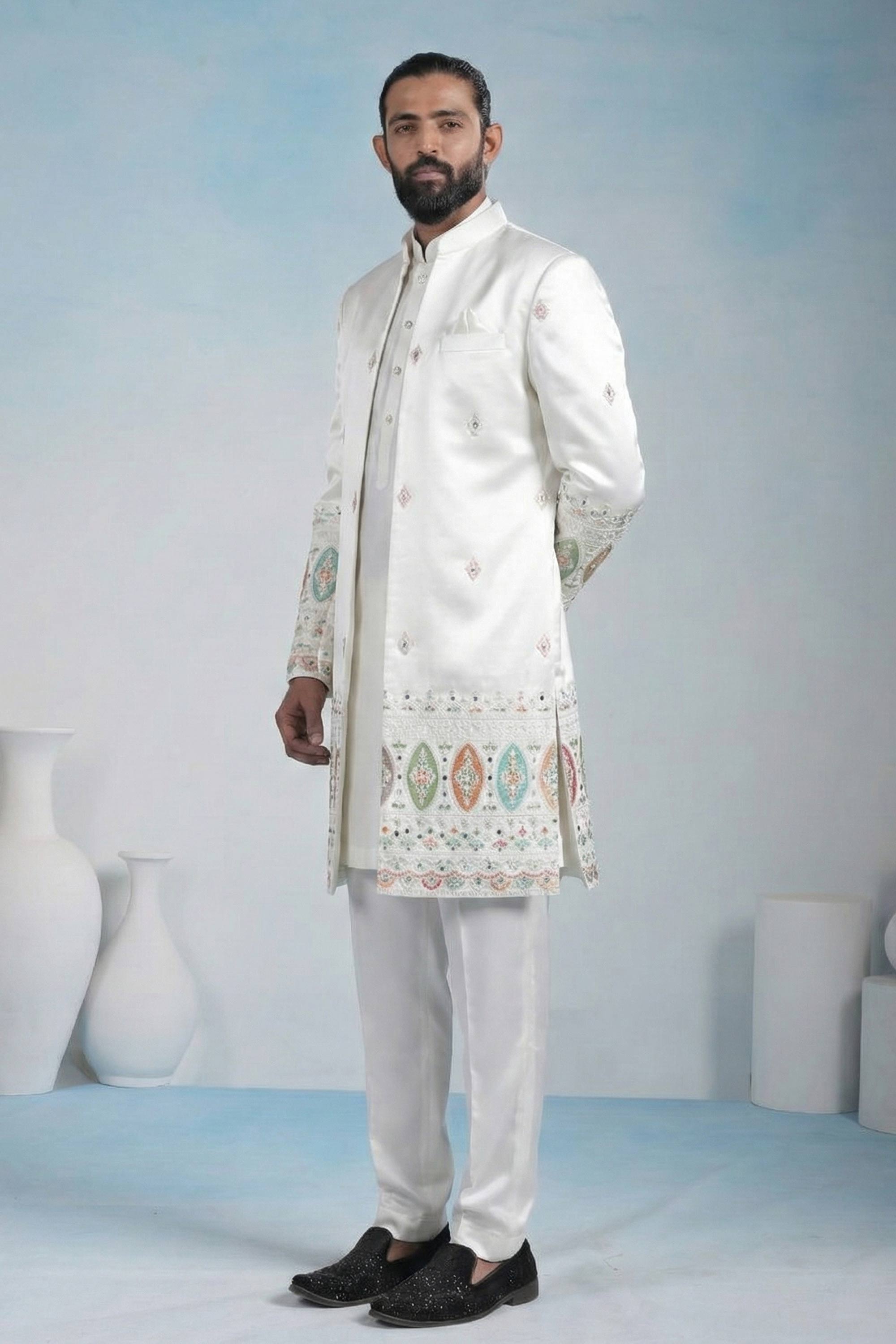 Off White Wedding Wear Fancy Fabric Embroidered Readymade Indo Western For Men