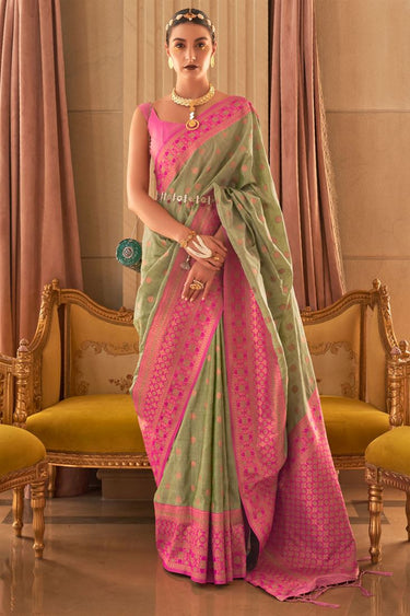 Olive Color Imperial Silk Fabric Weaving Designs Saree