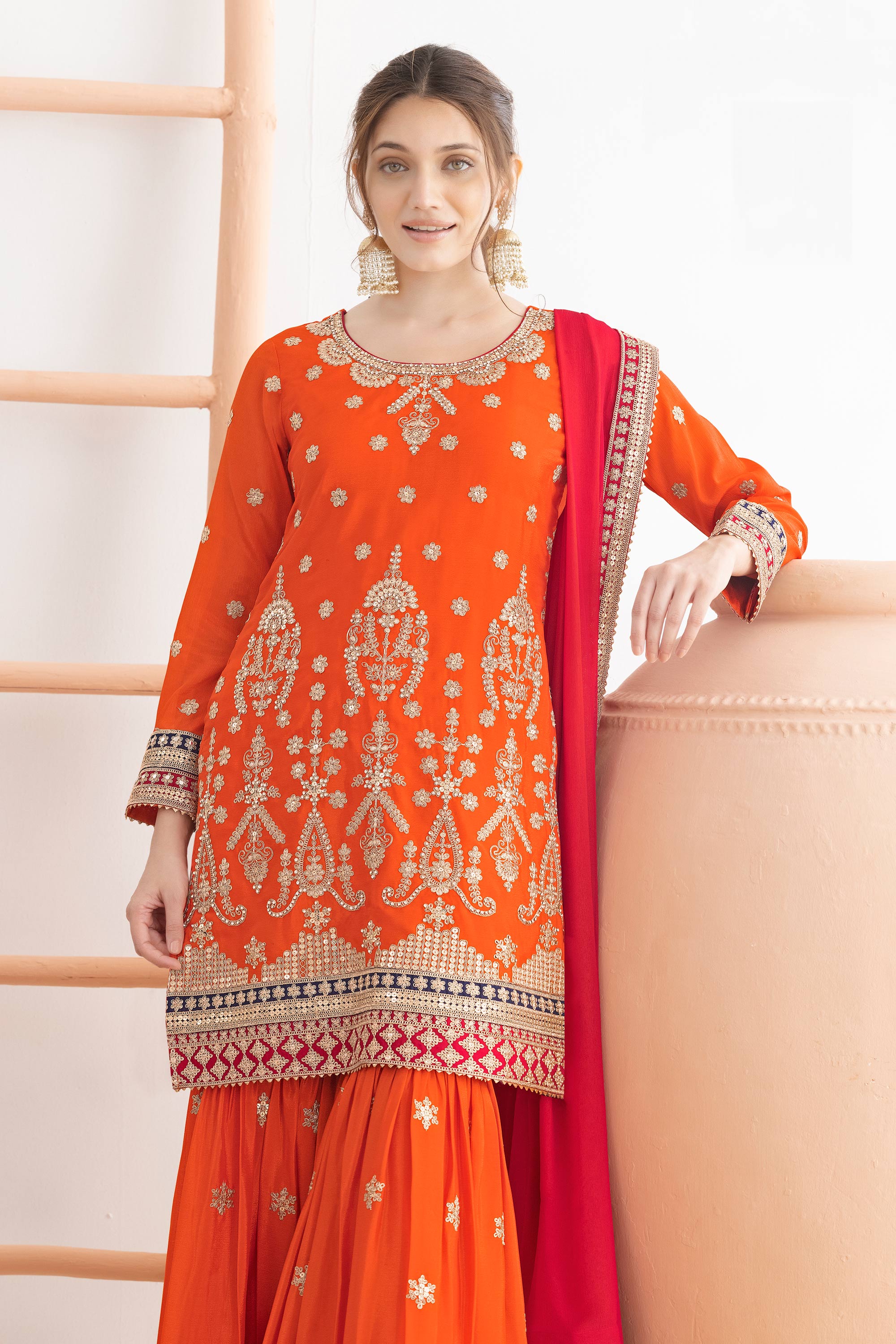 Orange Chinon Embroidered Readymade Sharara Salwar Kameez