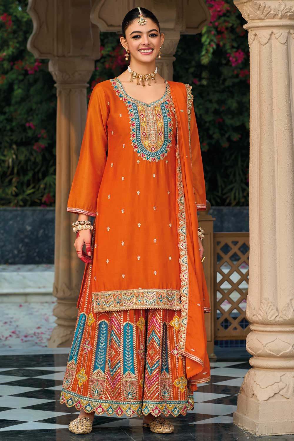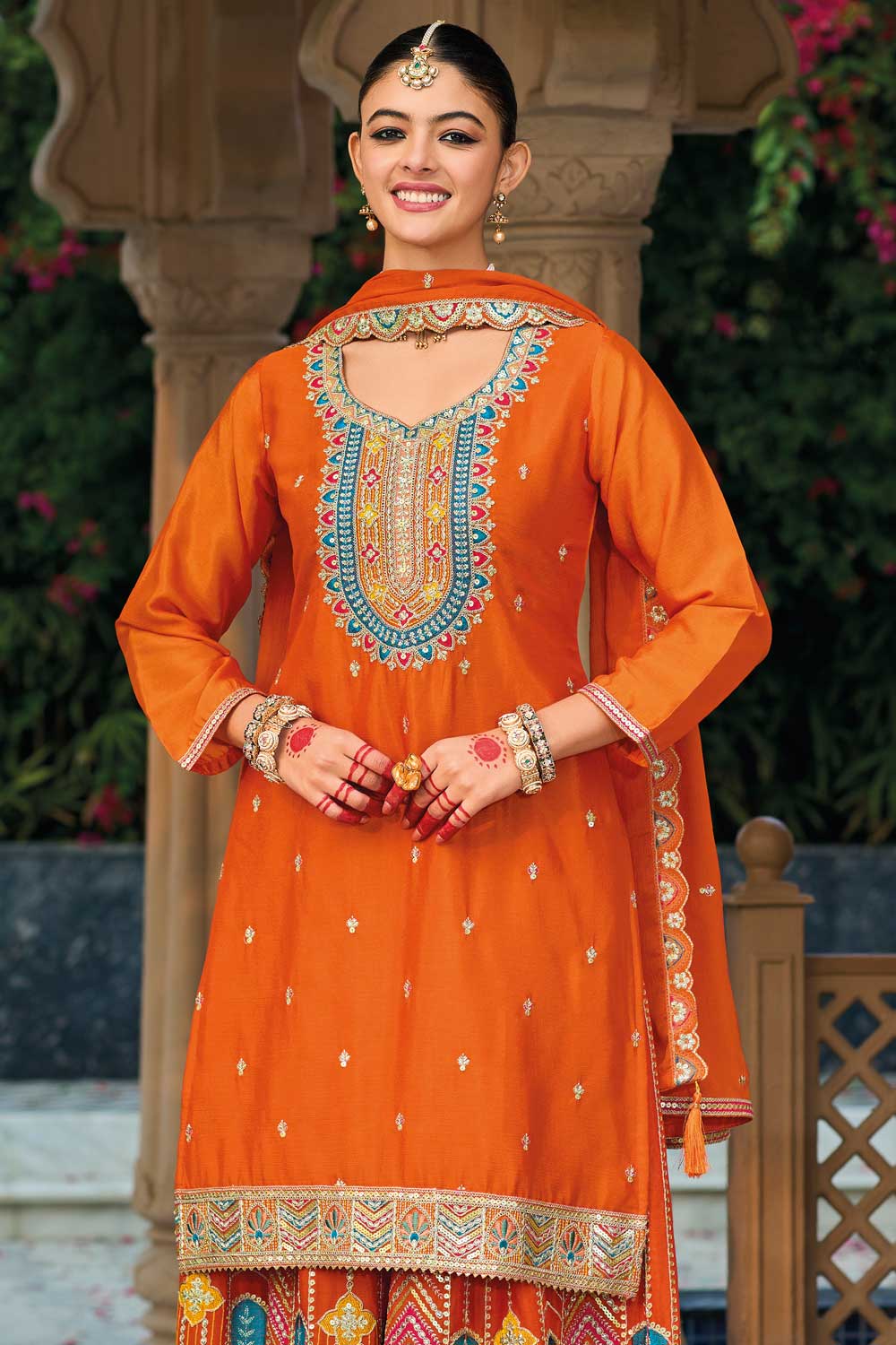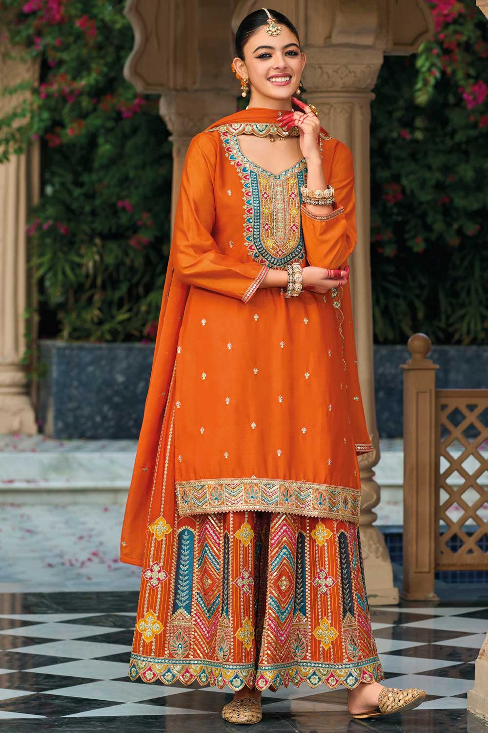 Orange Color Exquisite Readymade Palazzo Suit In Chinon Fabric