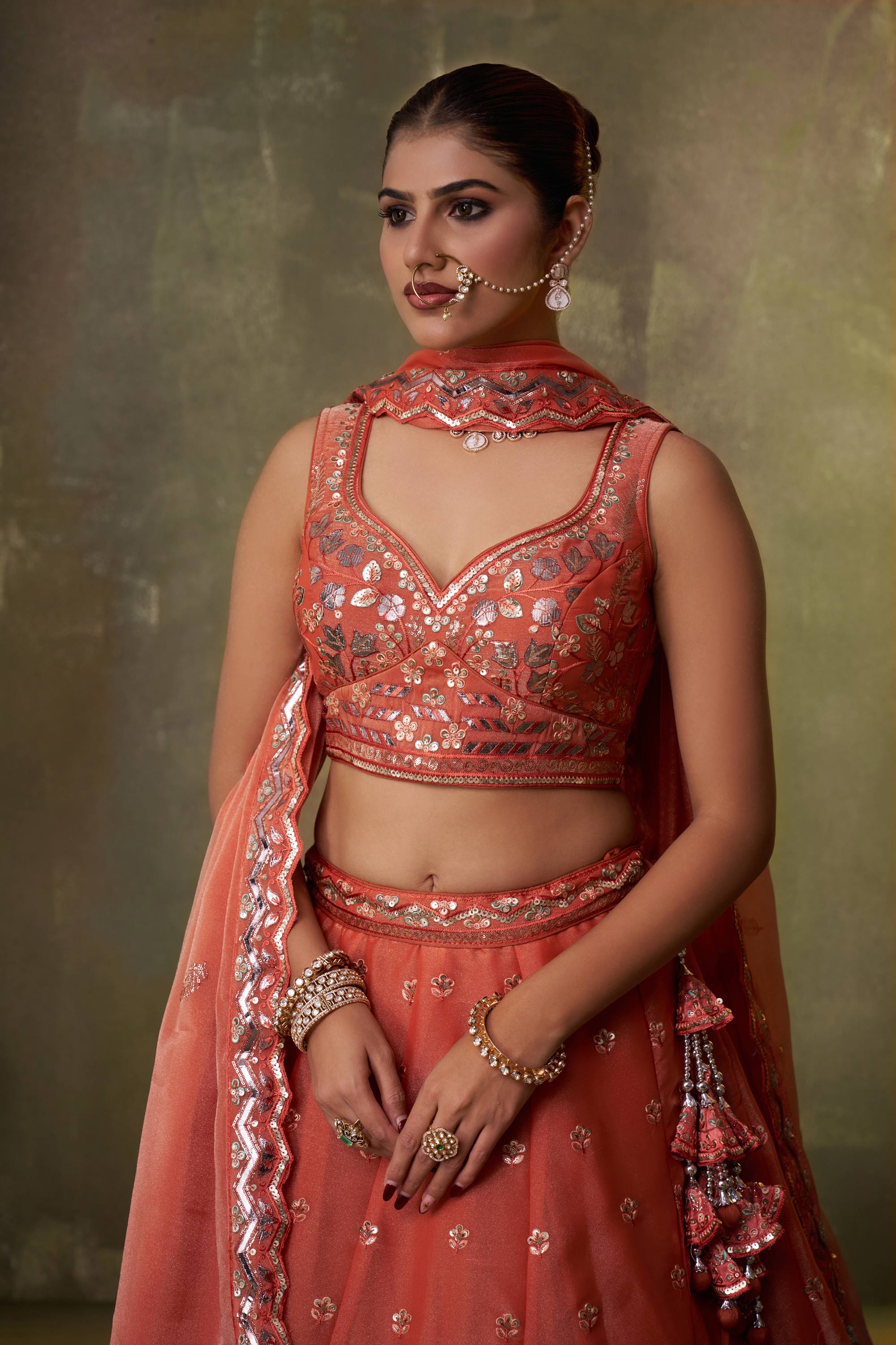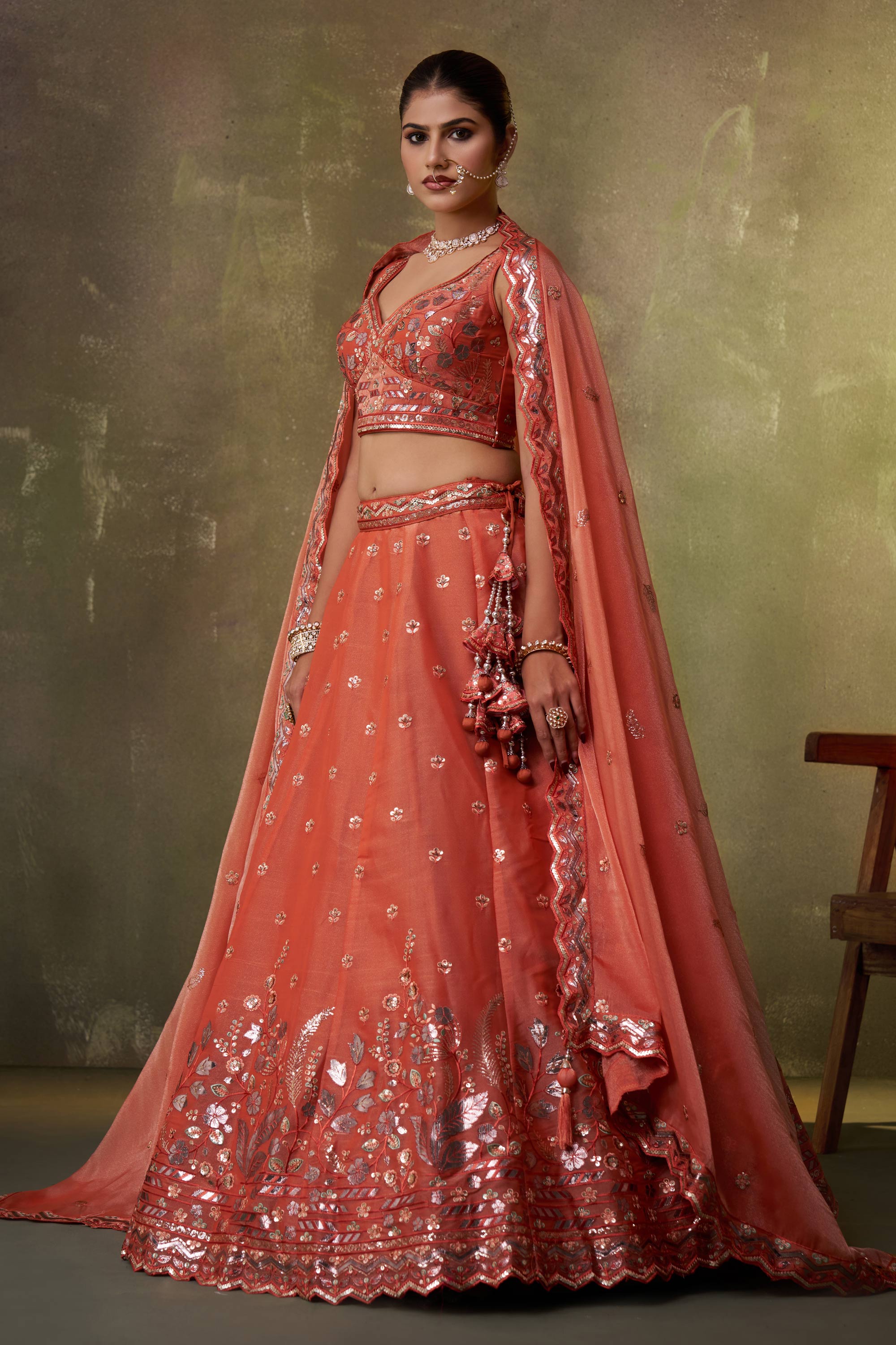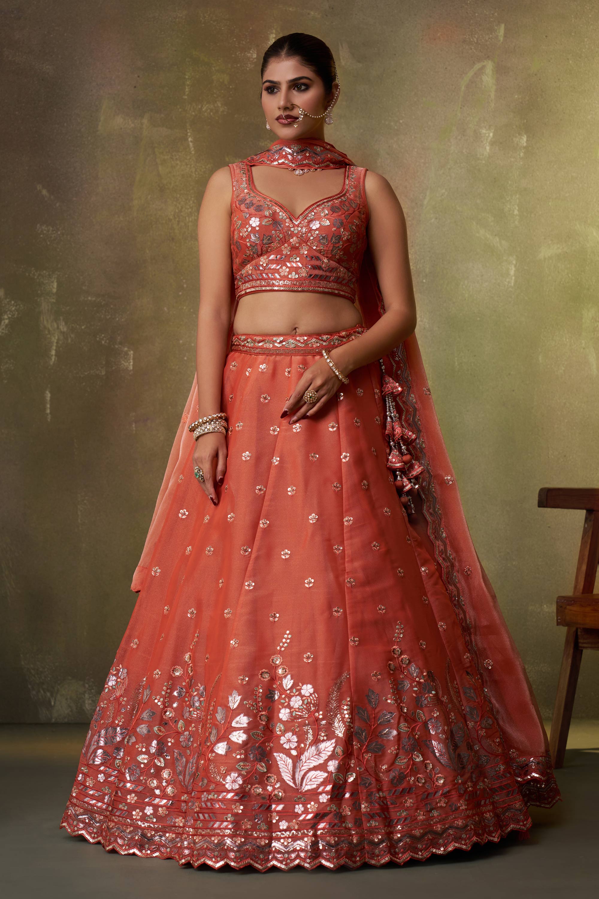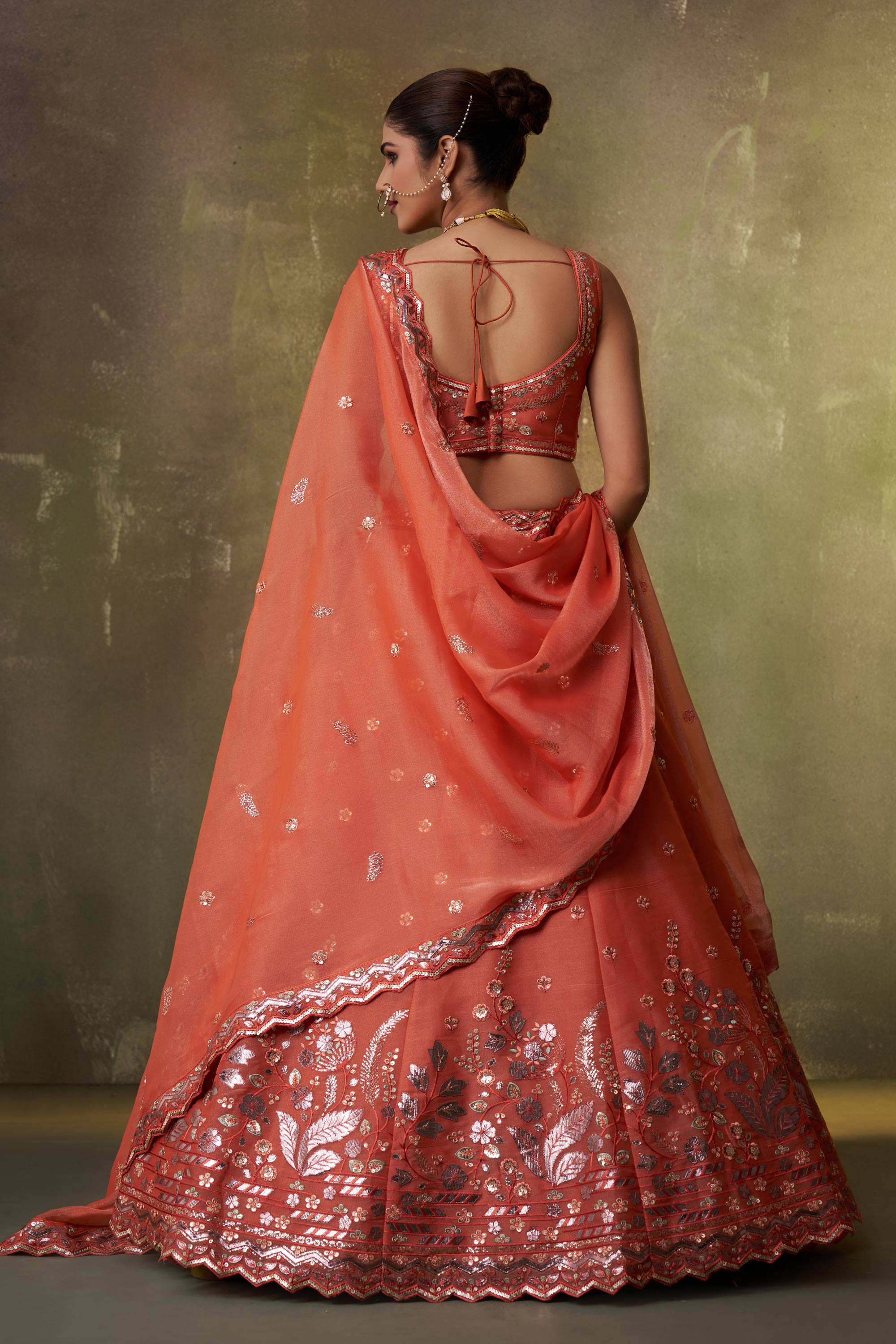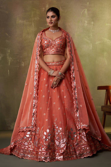 Orange Wedding Wear Organza Embroidered Lehenga Choli