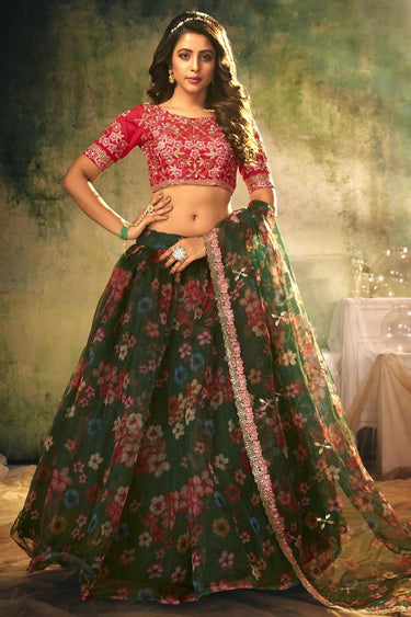 Organza Fabric Digital Print Floral Pleated Fancy Lehenga Choli In Dark Green Color