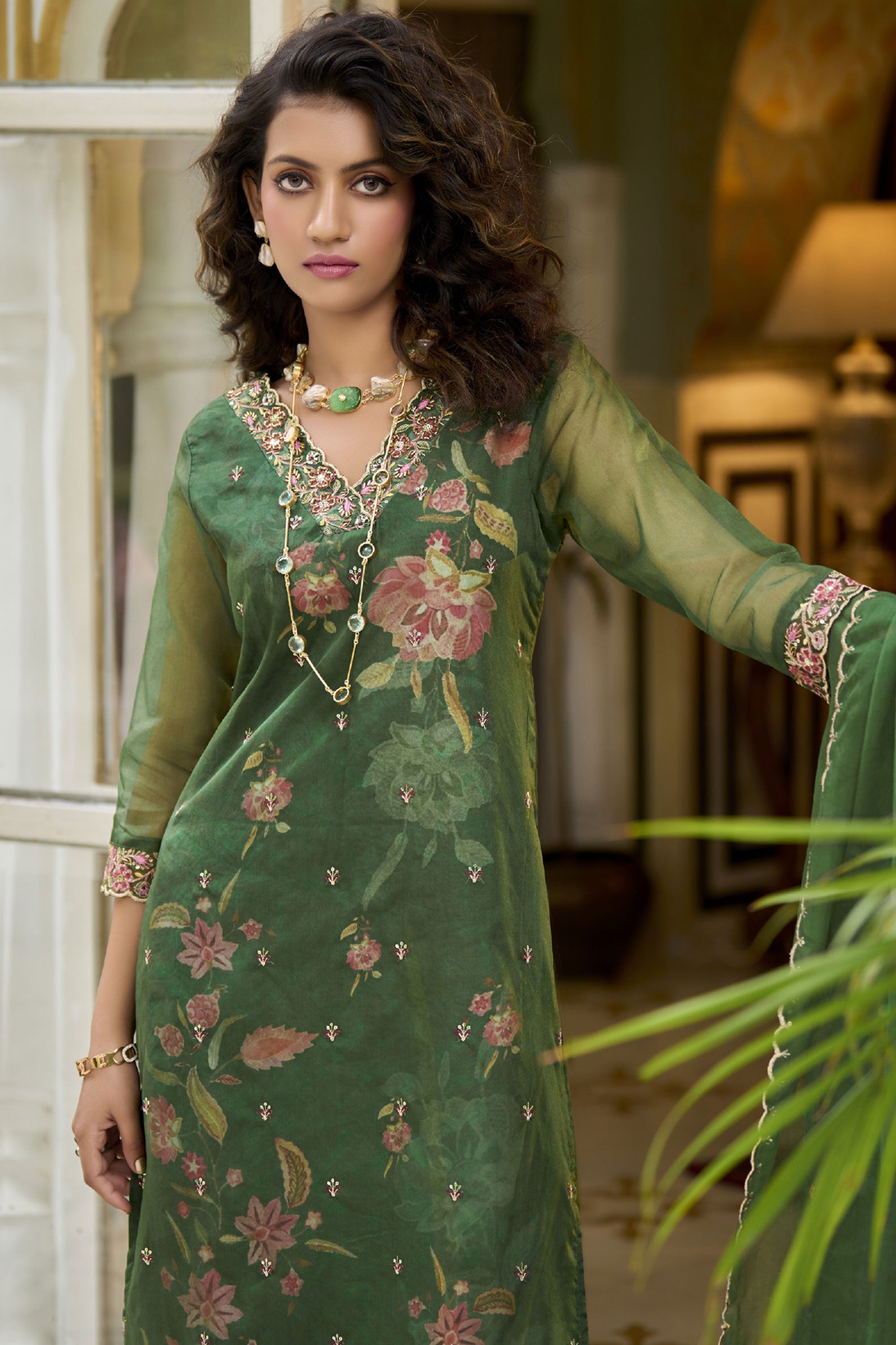 Organza Fabric Embroidered Function Wear Readymade Straight Cut Salwar Kameez In Green Color