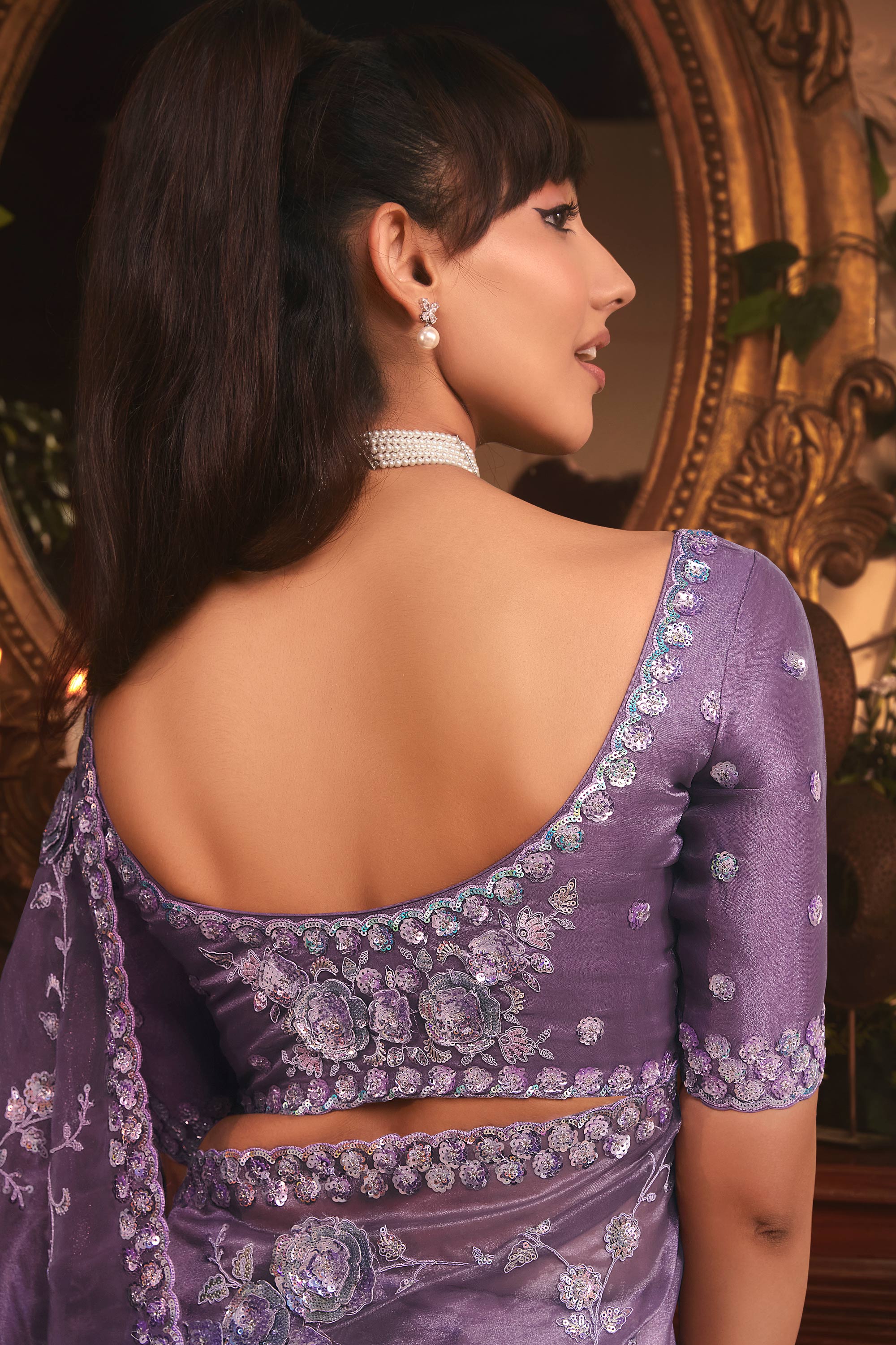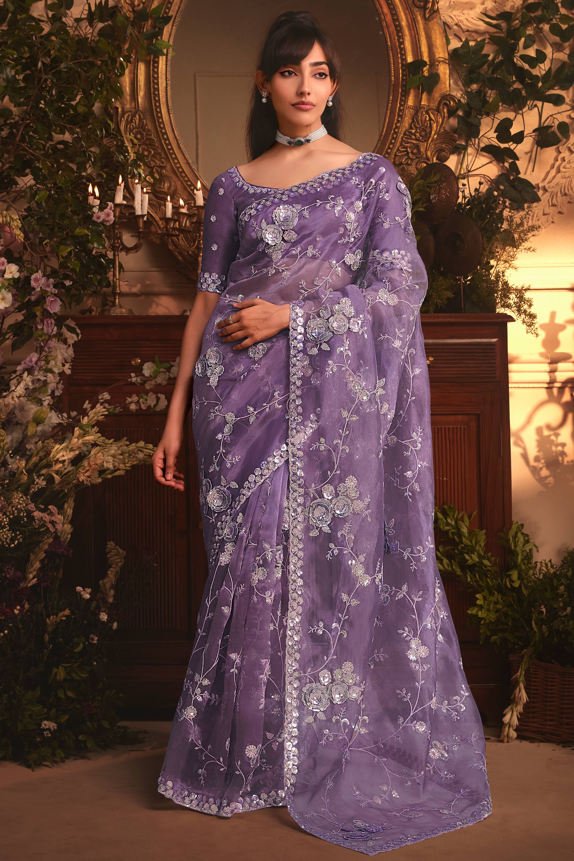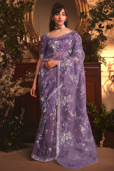 Organza Fabric Lavender Color Excellent Saree With Border Work