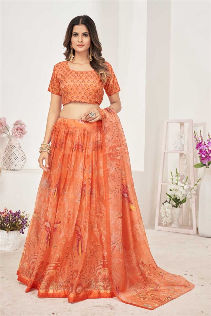 Organza Fabric Orange Color Magnificent Printed Lehenga