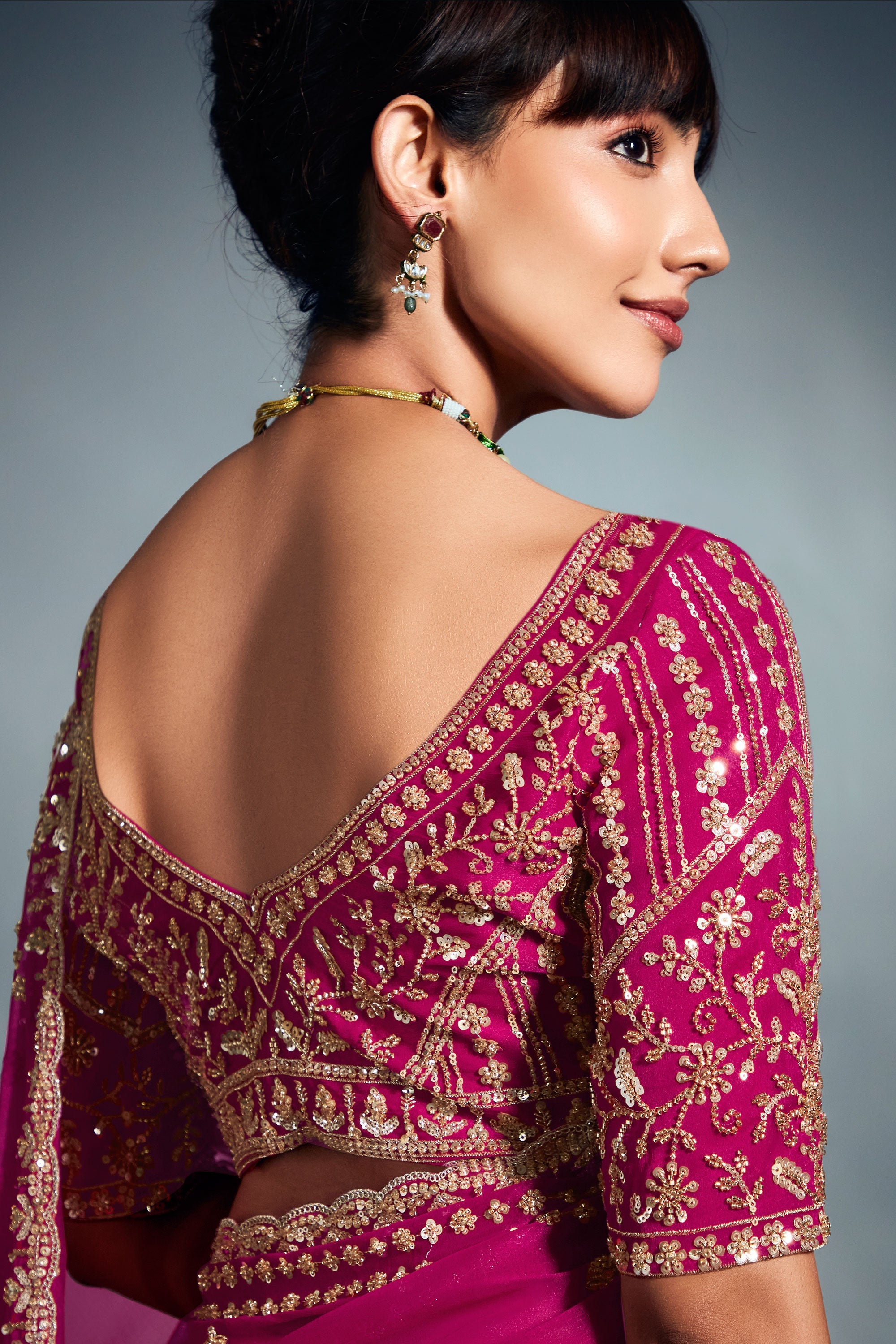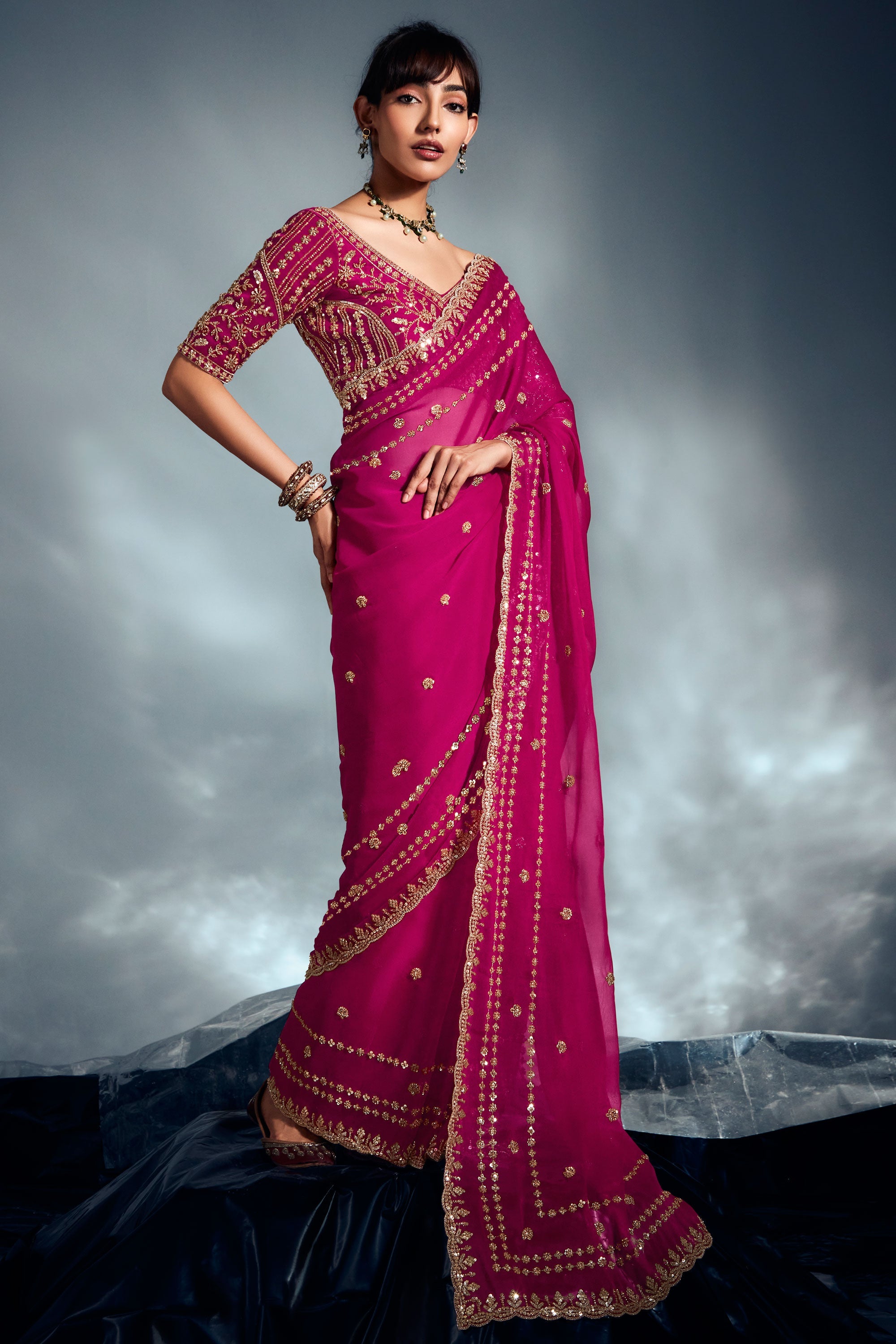 Organza Fabric Rani Color Excellent Saree With Fancy Heavy Work