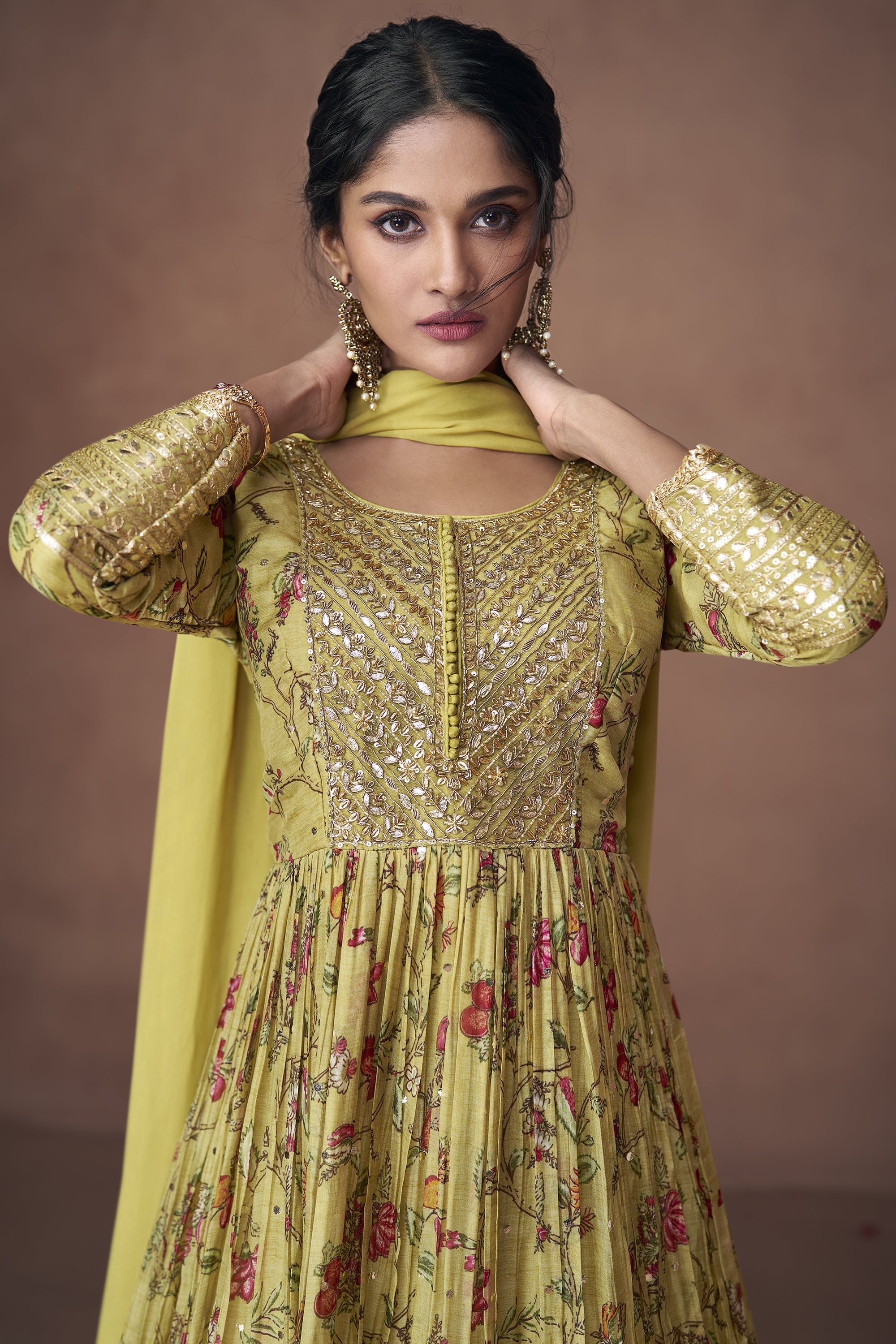 Elevate your party attire with this stunning Organza Silk Fabric Rich Color Mesmeric Digital Printed Readymade Anarkali Style Long Gown With Dupatta. The rich, bold colors and intricate digital print create a mesmerizing effect that will make you the star of any party. This ready-made Anarkali style long gown is made from high-quality organza silk fabric for a luxurious feel and features elegant embroidery on the neckline, cuffs, and hemline for an added touch of sophistication. The matching dupatta completes the look, making it perfect for weddings, parties or any special occasion. No more worries about spending hours at the tailor's shop or struggling to find matching accessories! Make heads turn with this statement piece that requires minimal effort yet delivers maximum impact. Get ready to own every room you enter wearing this party-ready outfit!