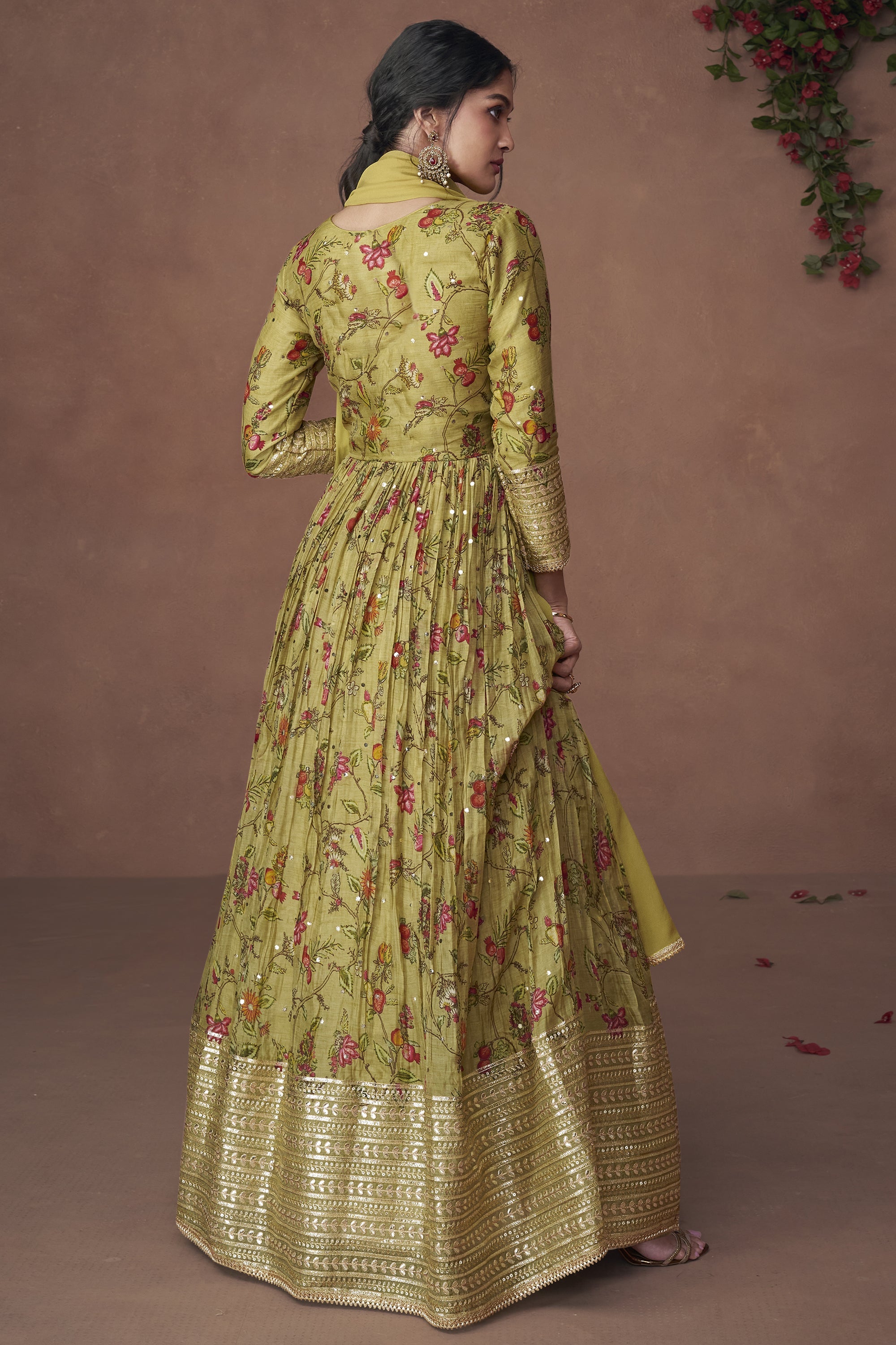 Organza Silk Fabric Green Color Party Wear Solid Digital Printed Readymade Anarkali Style Long Gown With Dupatta