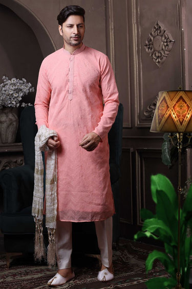 Peach Color Georgette Fabric Sangeet Wear Stylish Readymade Kurta Pyjama For Men