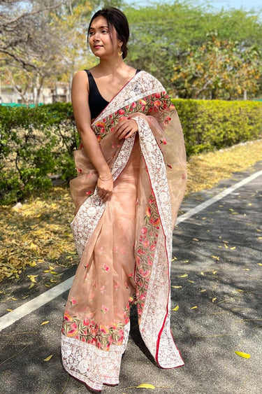 Peach Organza Lucknowi Chikankari Saree