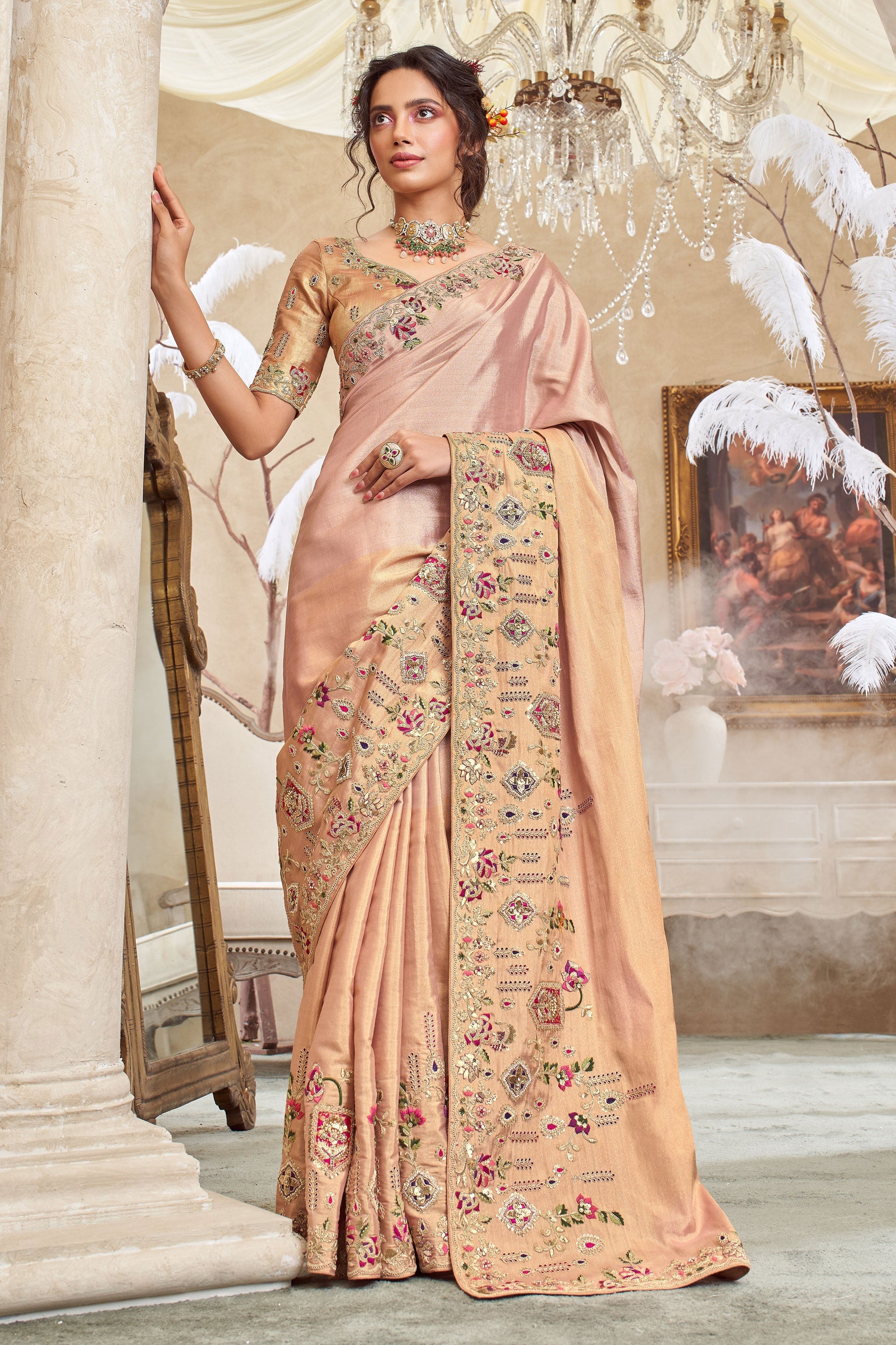 Peach Wedding Wear Embroidered Viscose Silk Fabric Saree