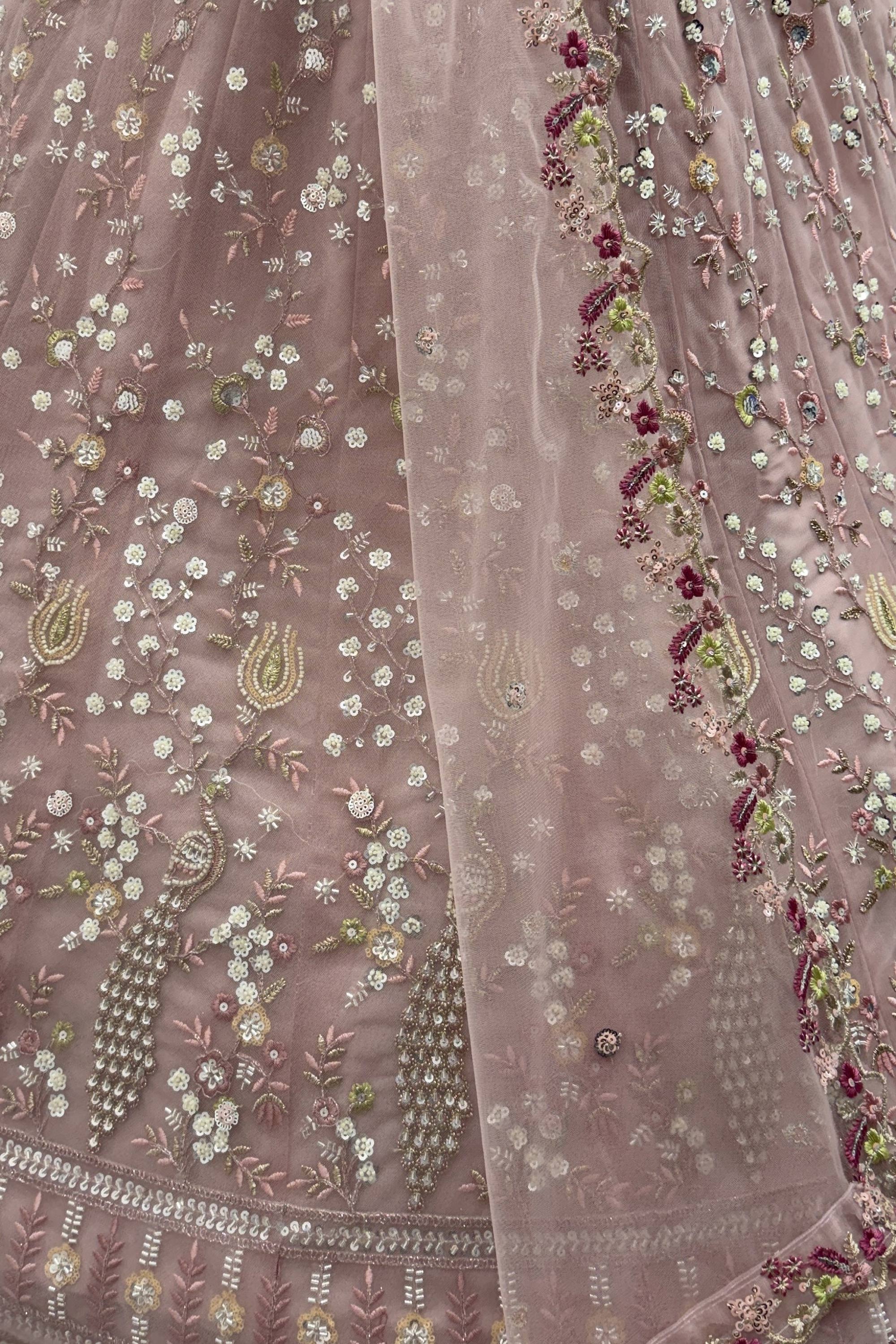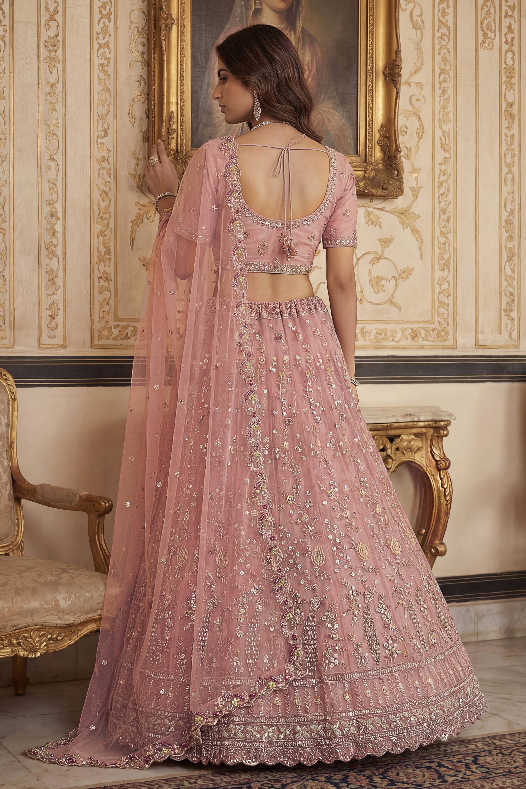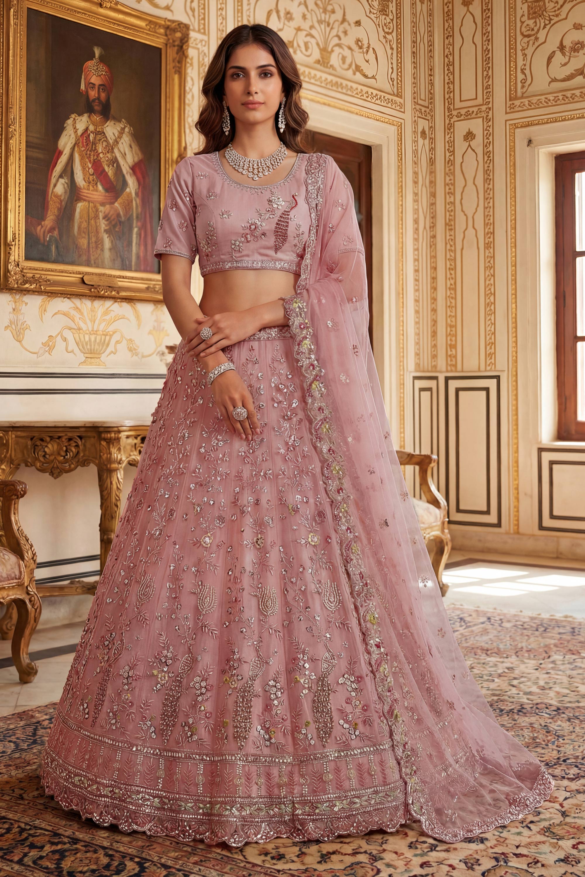 Peach Wedding Wear Net Fabric Embroidered Lehenga Choli