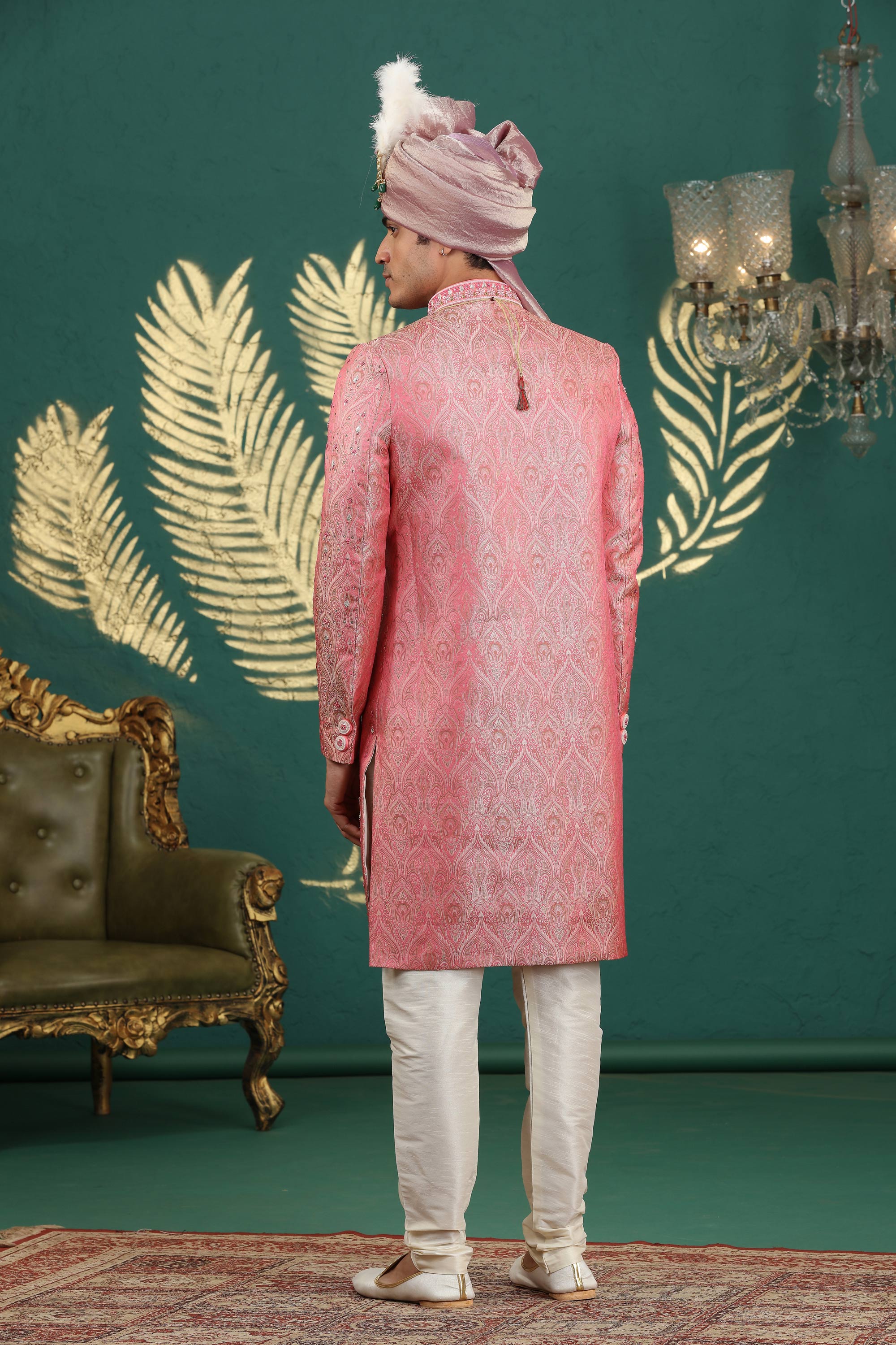 Pink Banarasi Jacquard Wedding Wear Readymade Sherwani For Men With Stole