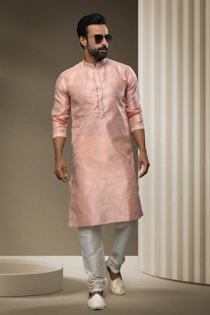 Pink Color Jacquard Silk Fabric Wedding Wear Readymade Kurta Pyjama For Men