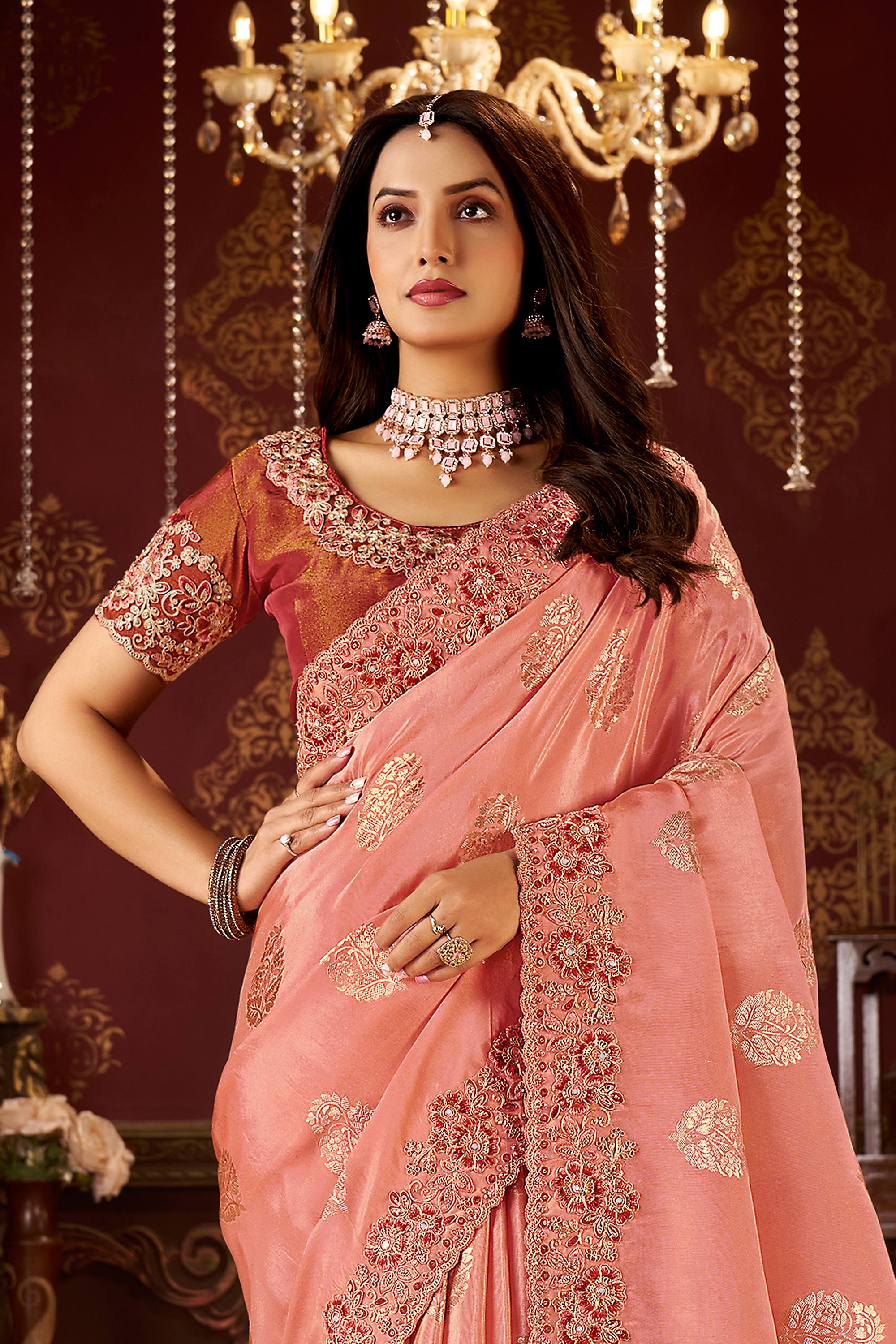 Gorgeous Reach Wedding Collection Saree: Add charm and glamour to your occasion with this Fancy Silk Designer Saree. Showcasing detailed embroidery along the border, this piece delivers an effortlessly sophisticated look. Perfect for brides or formal gatherings, the high quality silk enhances comfort and elegance. The saree includes an unstitched blouse, allowing a custom design that complements your personality. Let this beautiful attire transform your event into an unforgettable celebration.