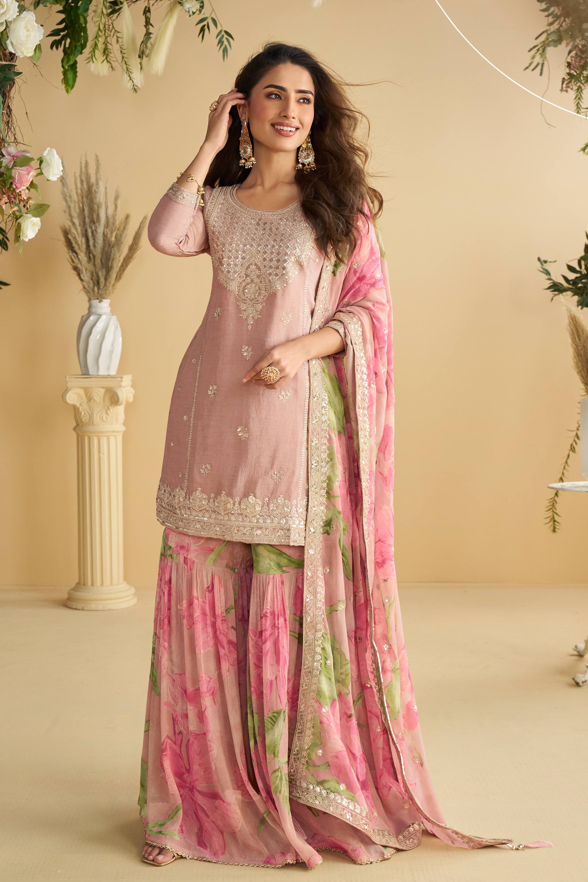 Pink Festive Wear Embroidered Chinon Readymade Palazzo Suit