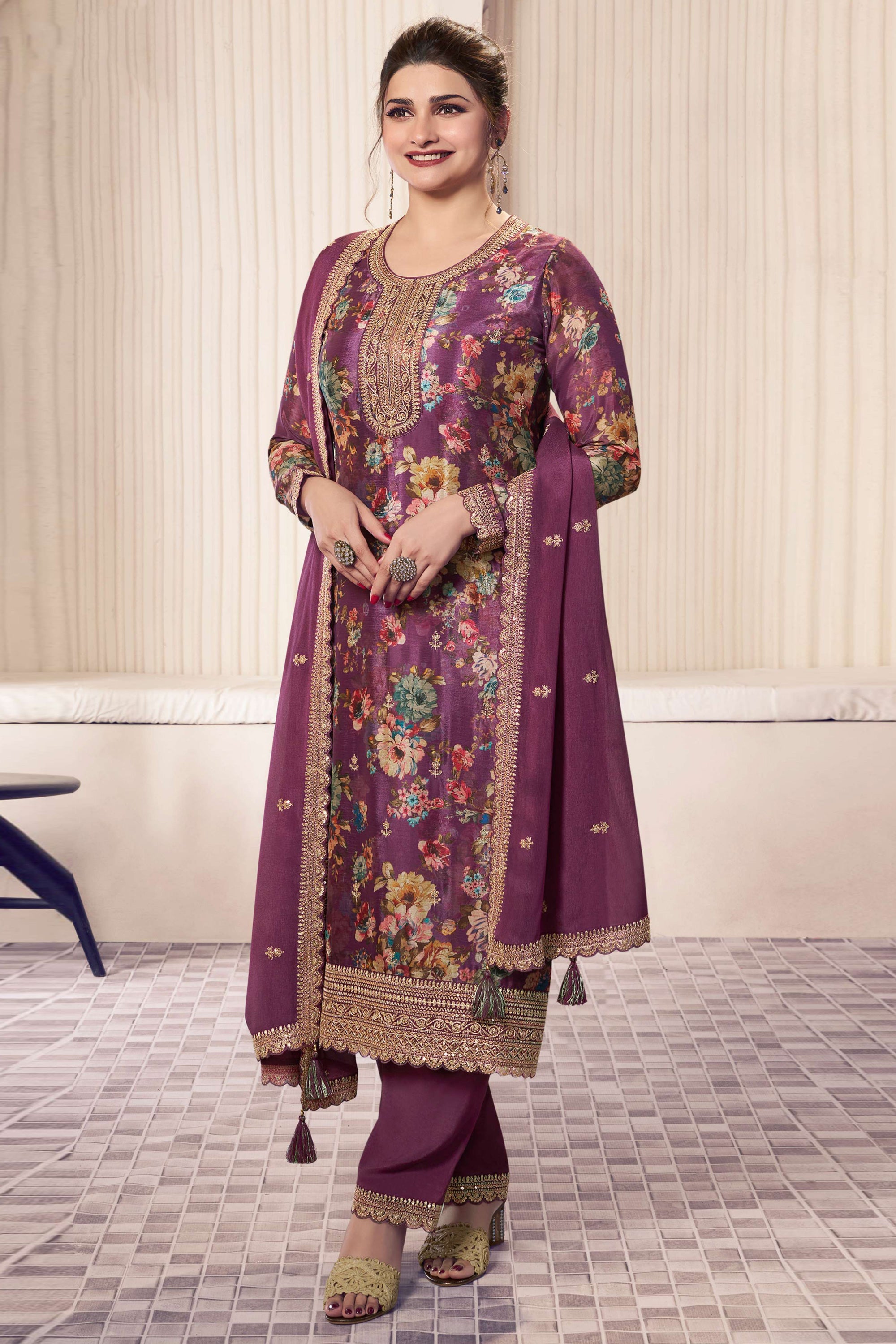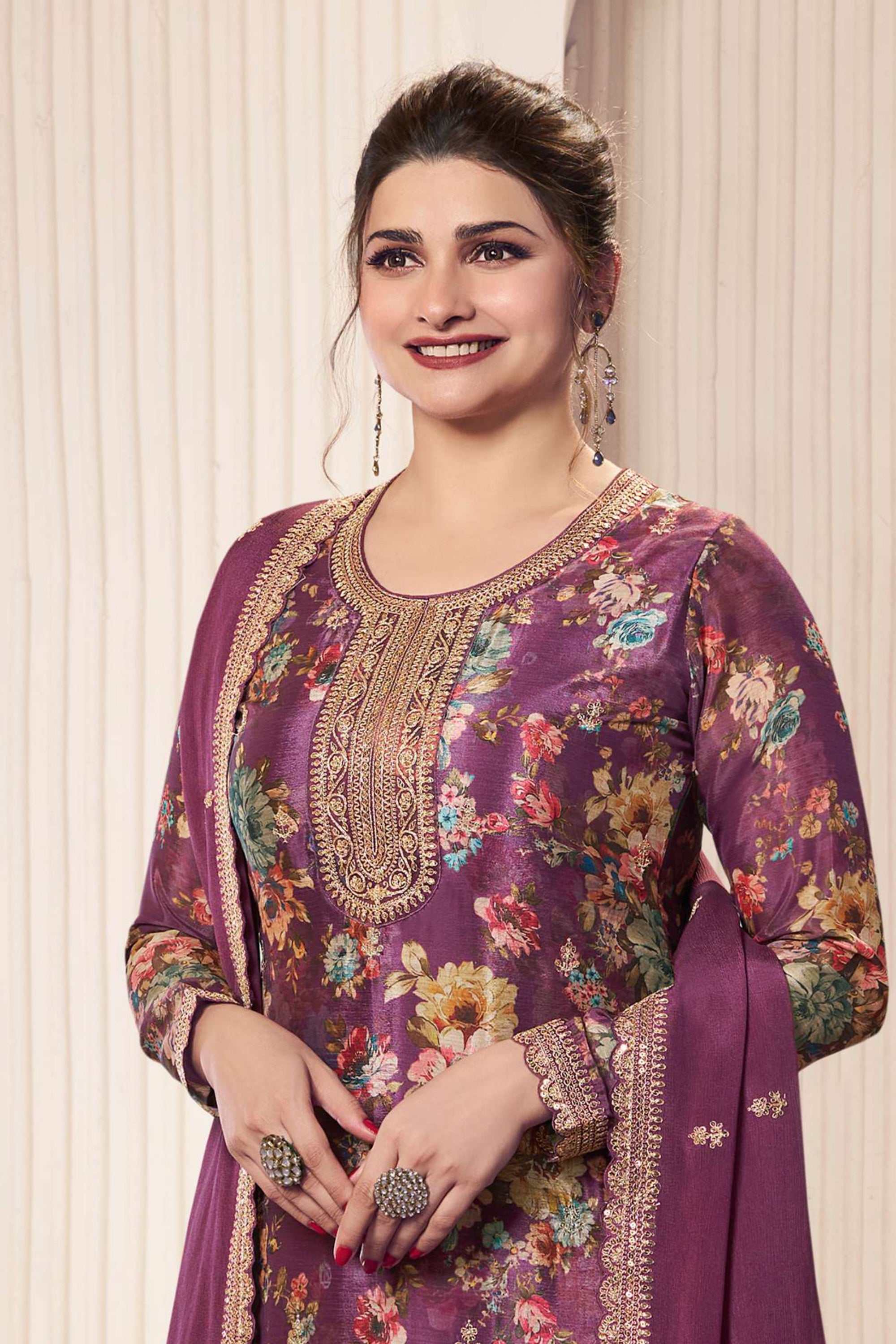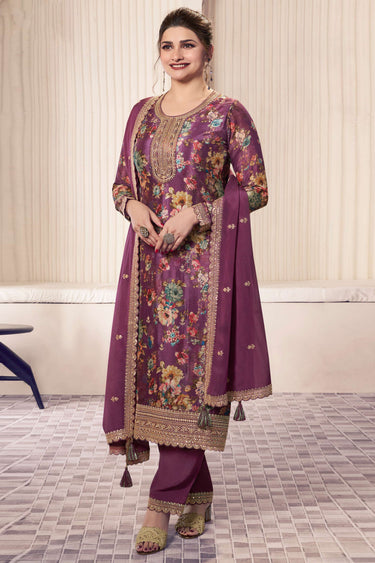 Prachi Desai Classic Purple Color Printed Salwar Suit In Chinon Fabric