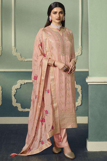 Prachi Desai Viscose Jacquard Fabric Peach Color Festive Wear Embroidered Designer Long Straight Cut Salwar Kameez