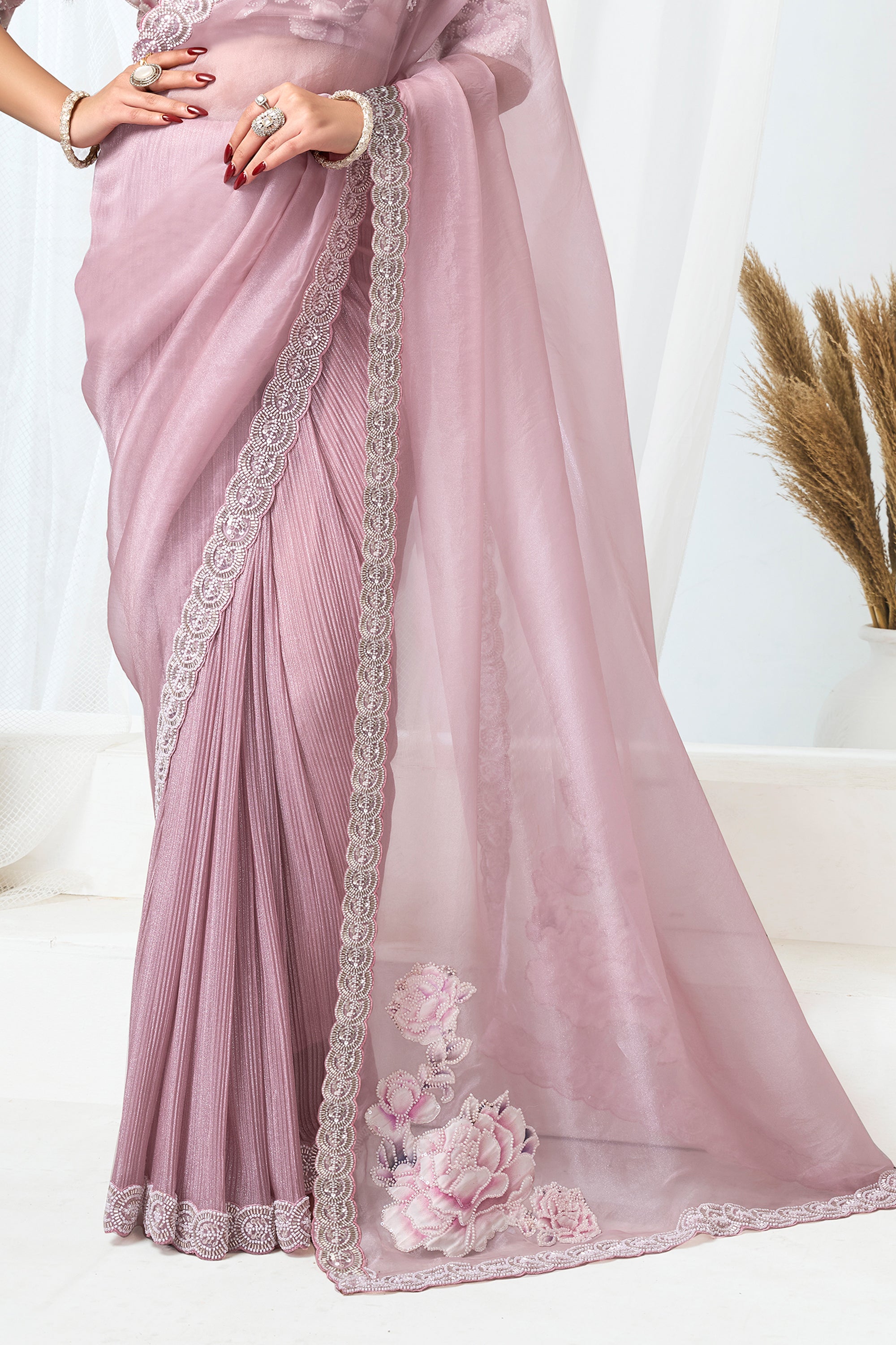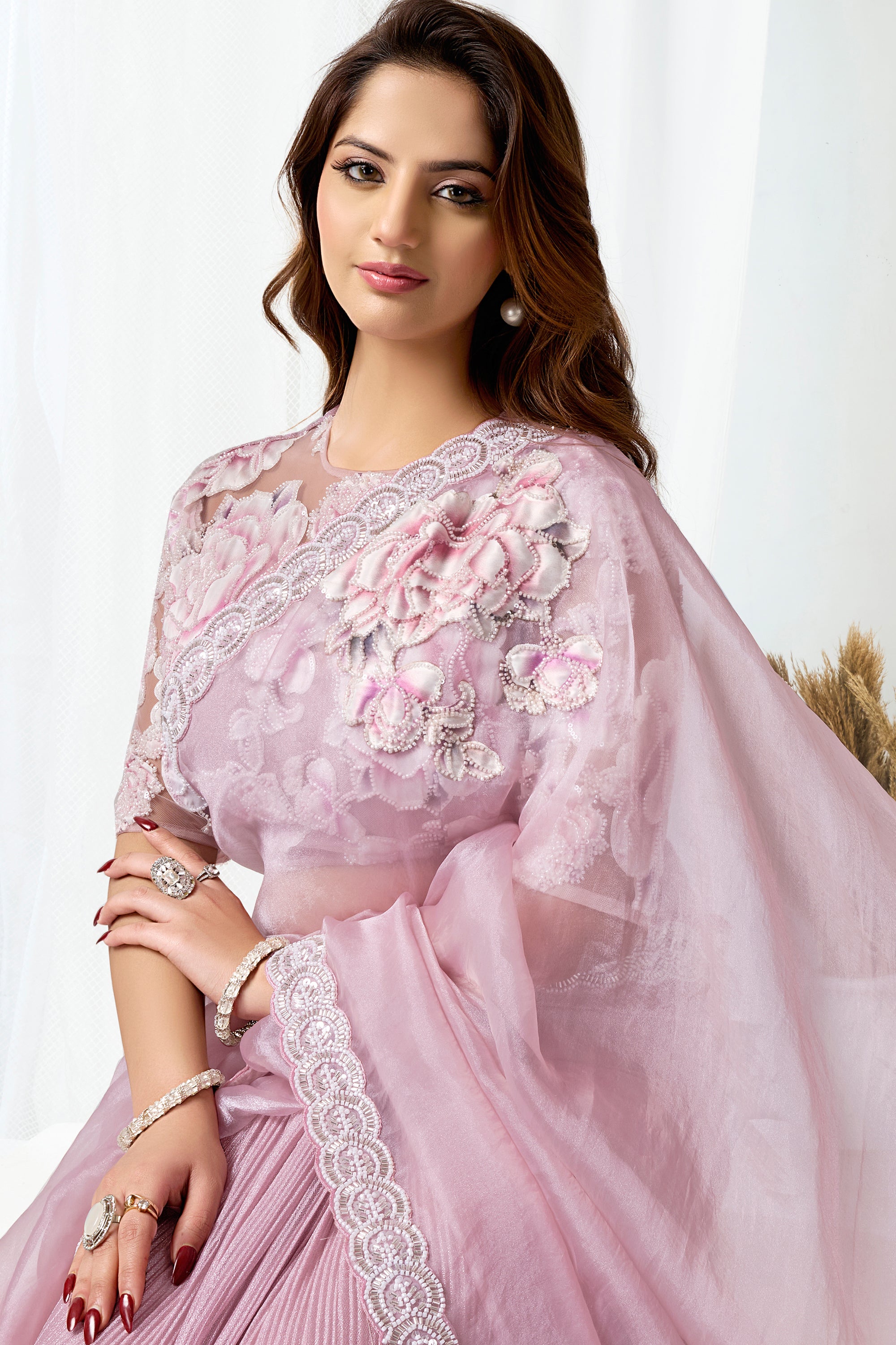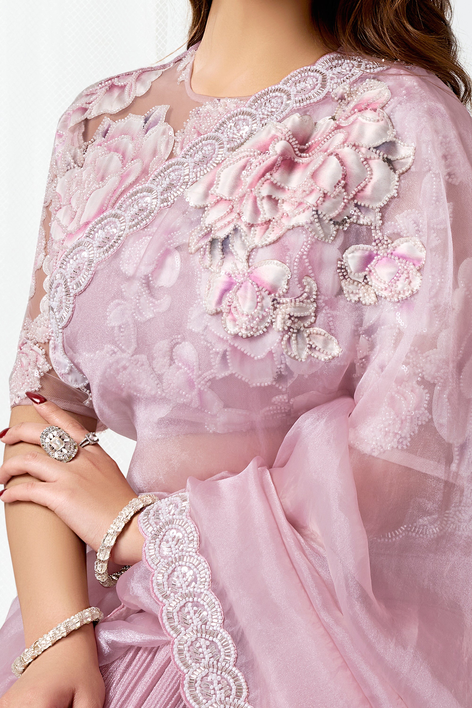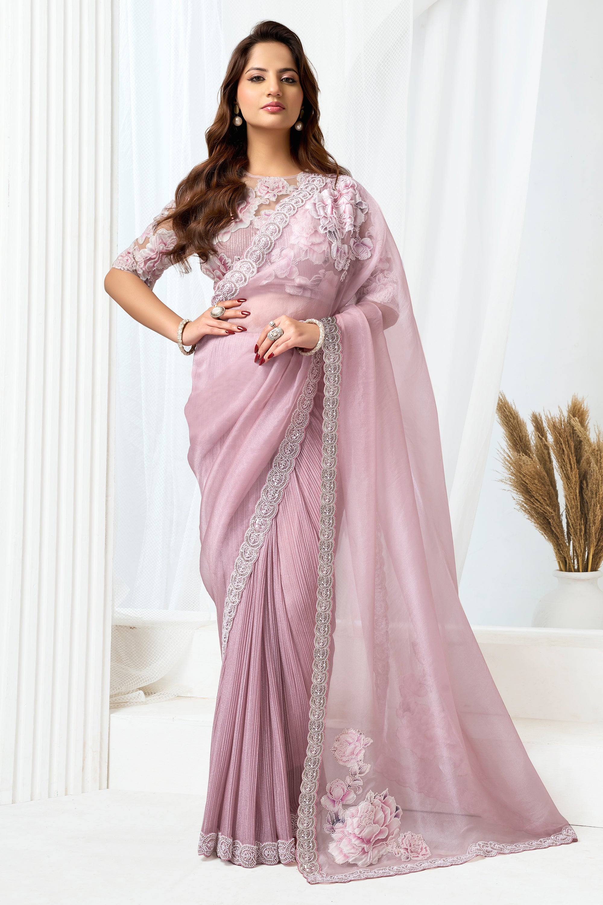 Premium Pink Organza Heavy Sequins Work Sangeet Special Readymade Saree