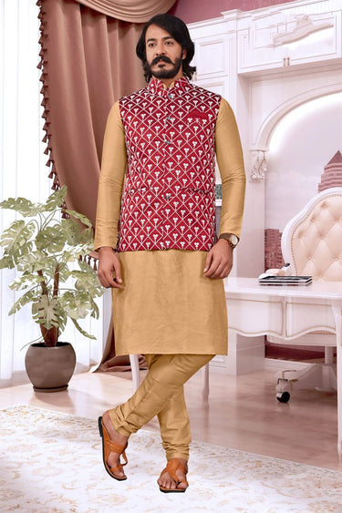 Pretty Cream Color Art Silk Fabric Wedding Wear Readymade Kurta Pyjama With Fancy Jacket